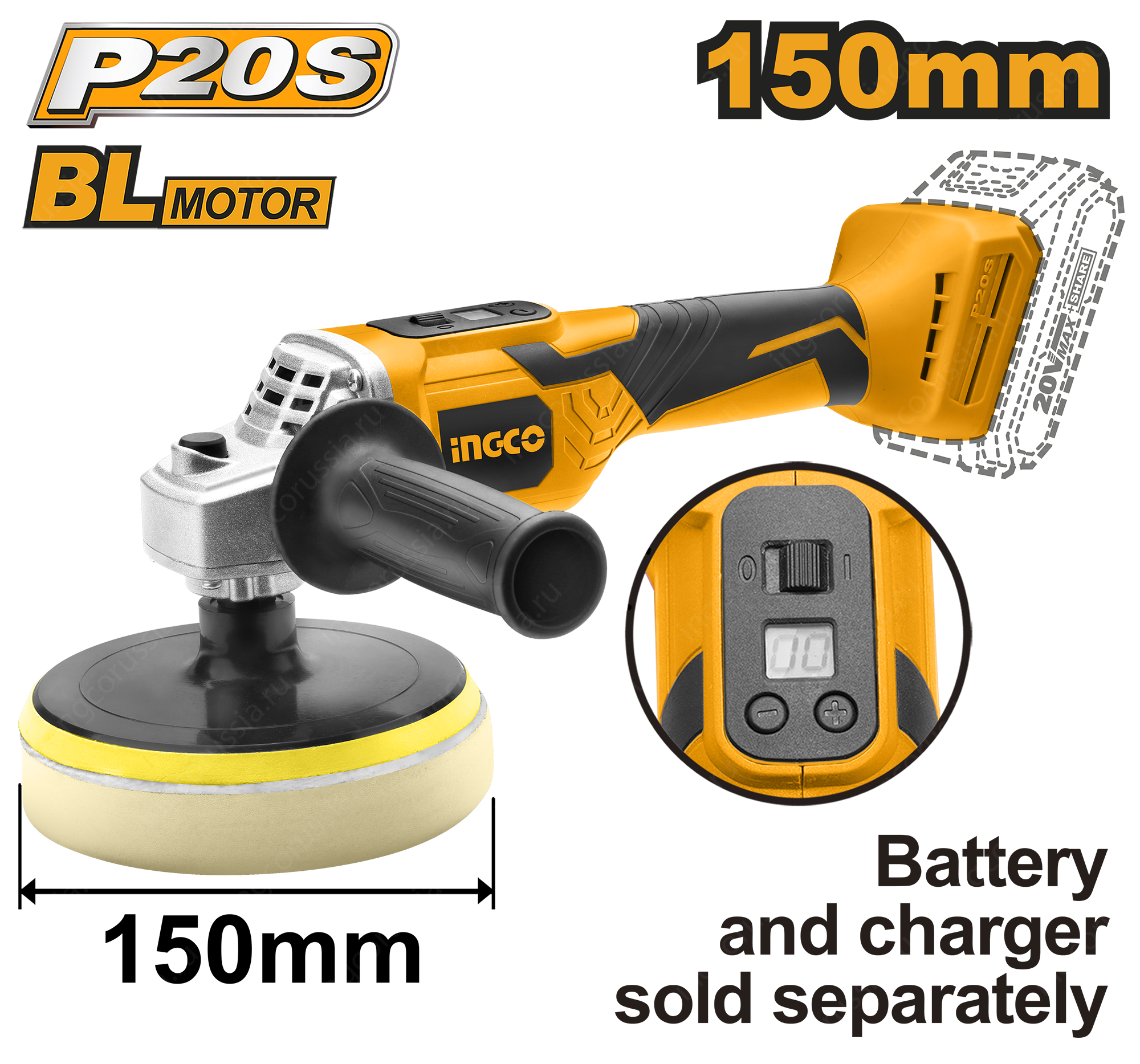 Машина полировальная аккумуляторная 150мм 20В INGCO APLI2001 INDUSTRIAL серии P20S бесщеточный, широко используется в автомастерских.