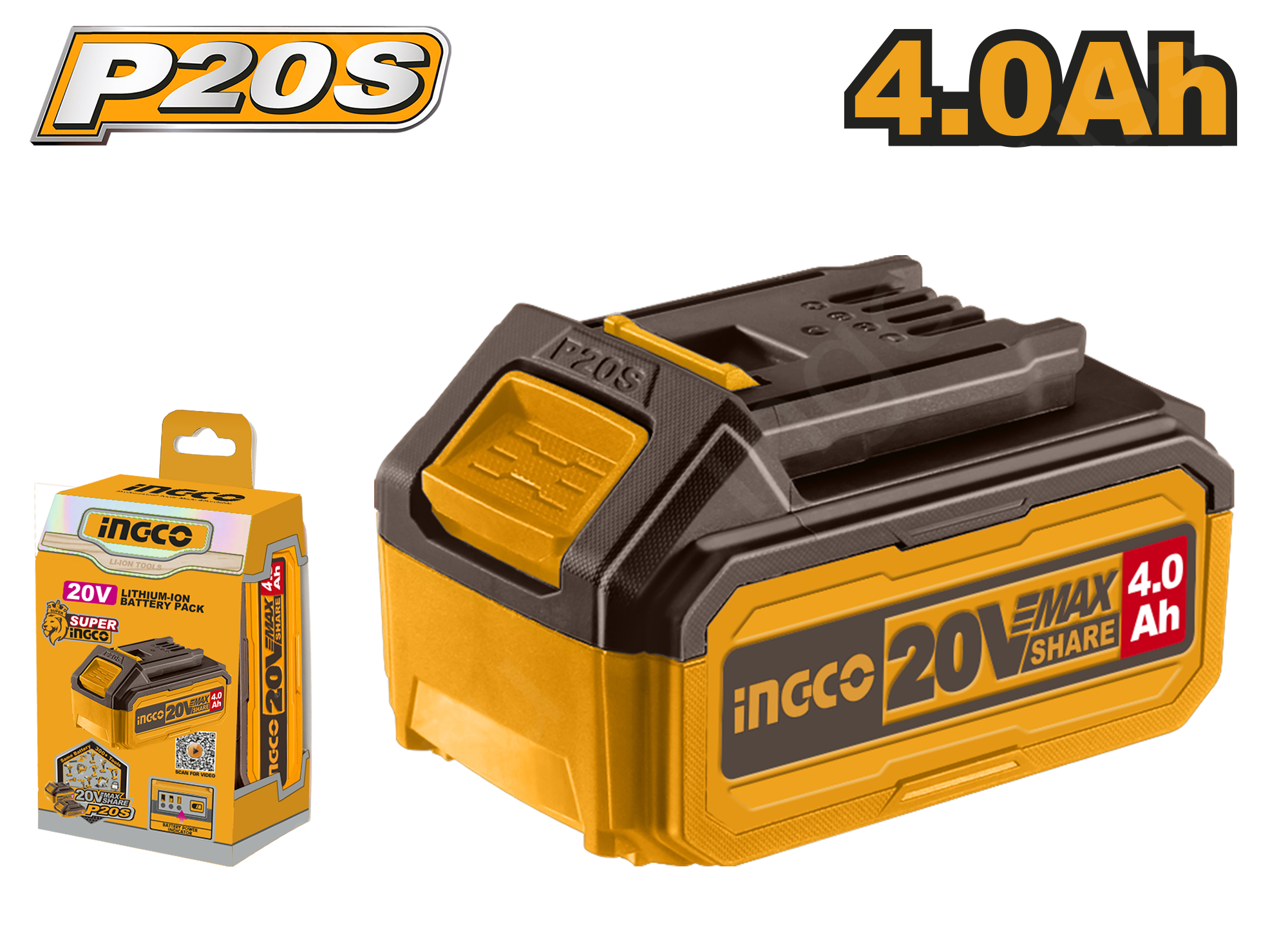 Аккумуляторная батарея Li-Ion 20 В INGCO FBLI2002 INDUSTRIAL емкостью 4 Ач подходит для всех аккумуляторных инструментов семейства P20S.
