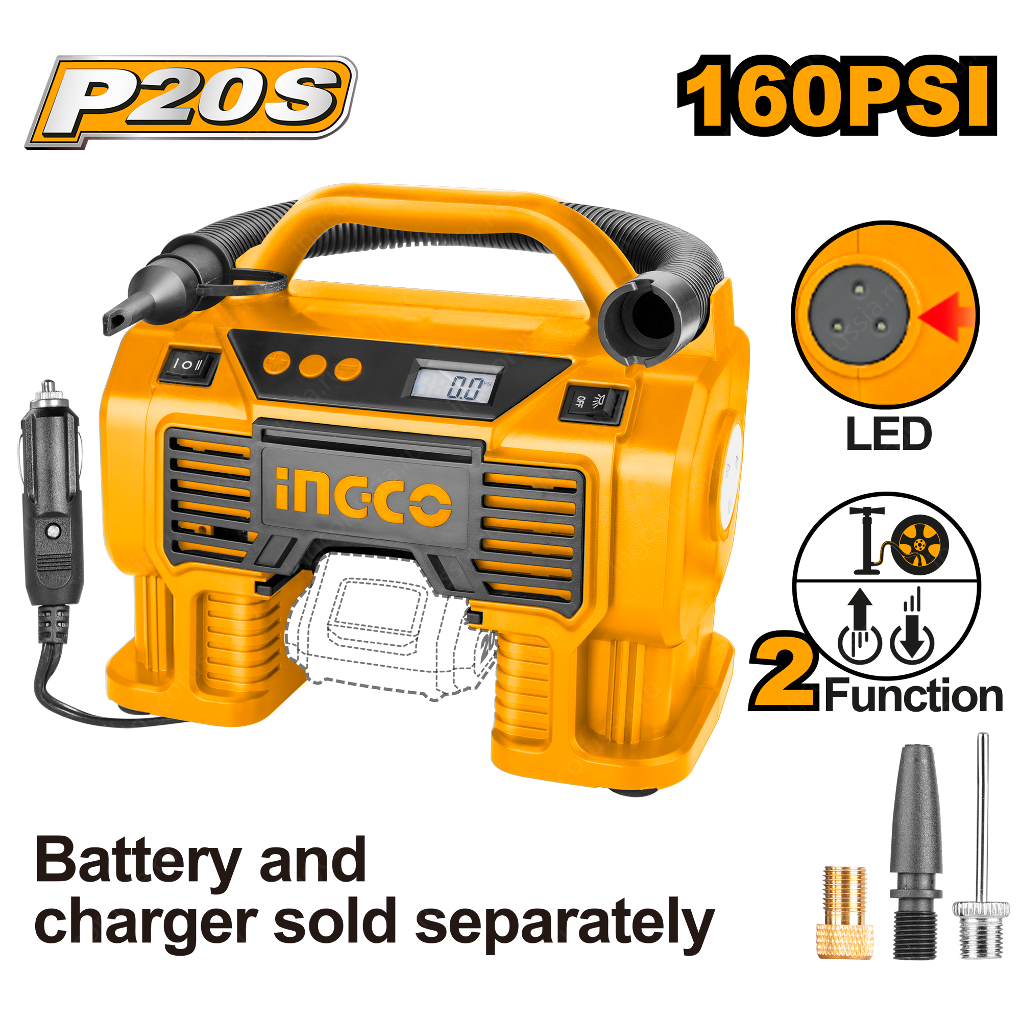 Автомобильный аккумуляторный компрессор 20В/12В INGCO CACLI2002 серии P20S может работать от прикуривателя автомобиля 12В, это компактное приспособление, которое с легкостью поместится в багажник любого транспорта.