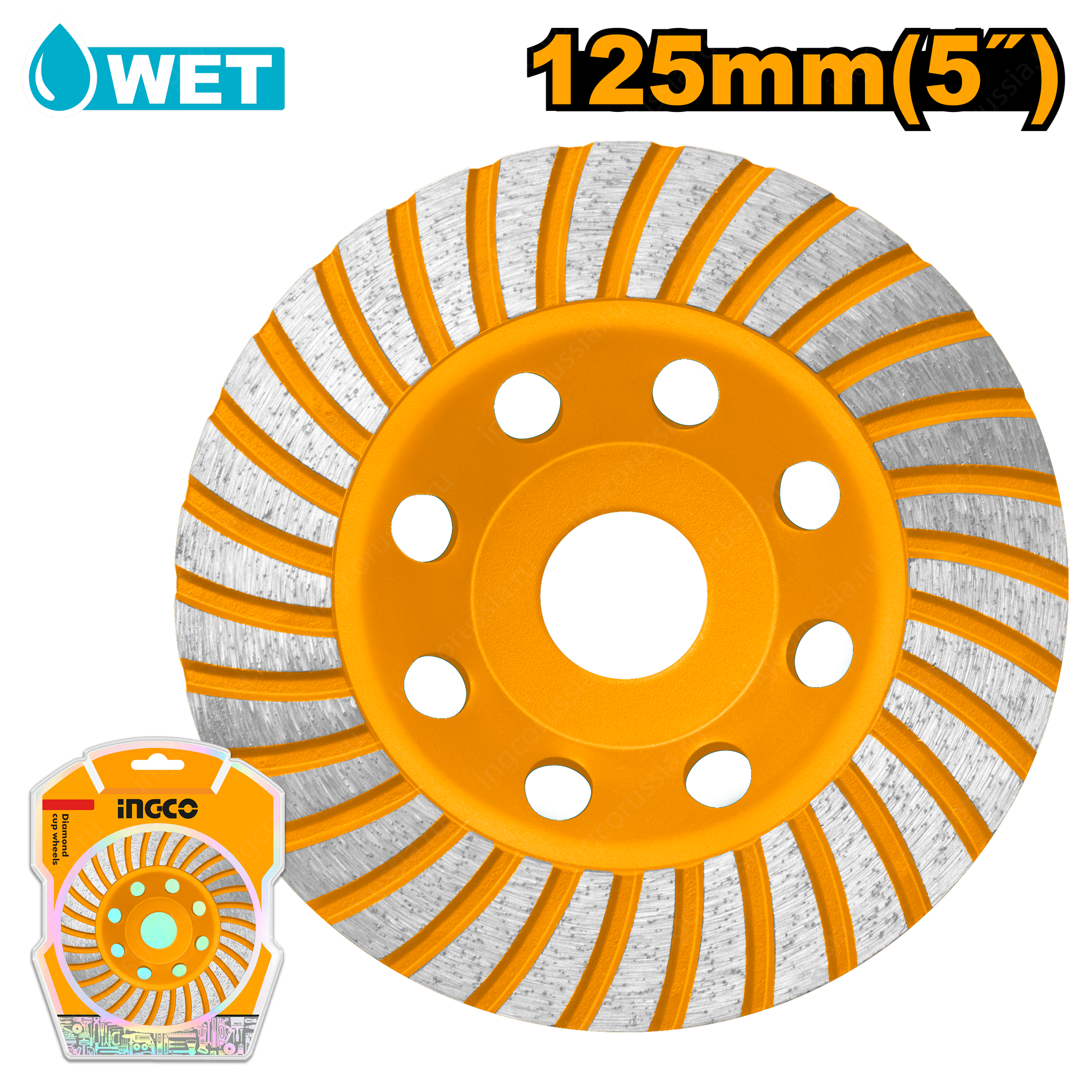 Сегментный чашечный шлифовальный диск 125 мм INGCO CGW011251 предназначен для шлифовки поверхностей из камня, бетона, мрамора, гранита, как рабочий элемент для углошлифовальной машины.