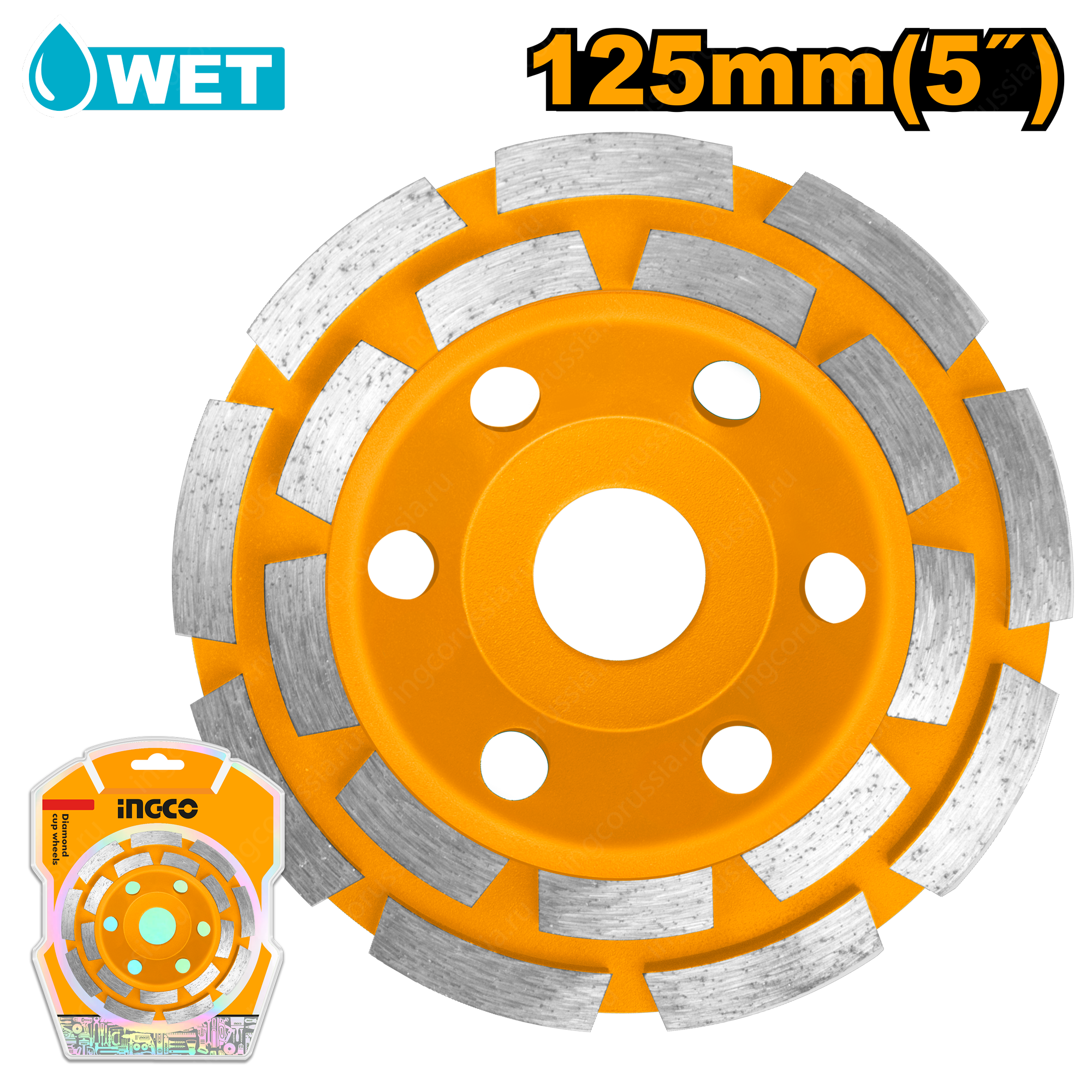 Двухрядный алмазный чашечный шлифовальный диск 125 мм INGCO CGW021251 предназначен для шлифовки поверхностей из камня, бетона, мрамора, гранита, как рабочий элемент для углошлифовальной машины.