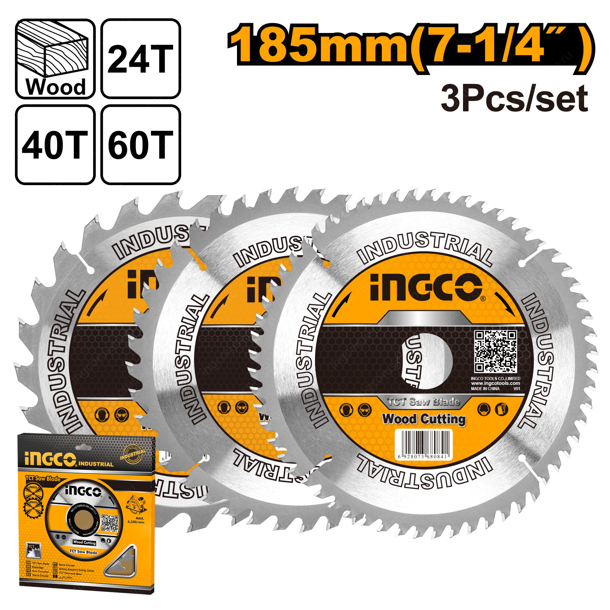 Набор пильных дисков по дереву 185х30 мм. 3 шт. INGCO TSB51852153 INDUSTRIAL предназначен для продольного и поперечного распила древесины по мягкой и твердой древесине, фанере, а также ДСП.
