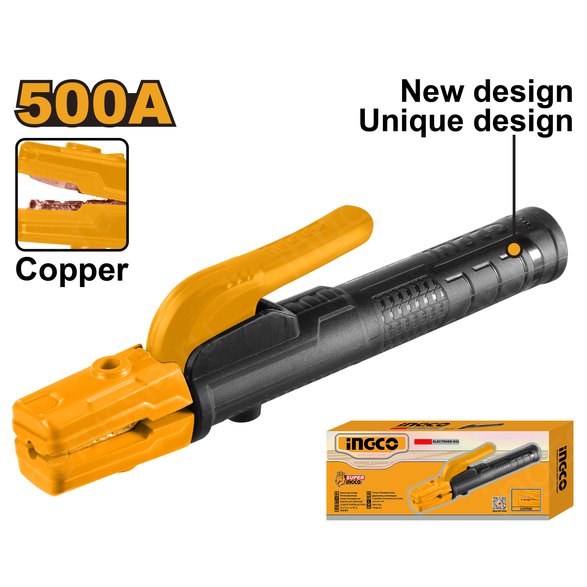 Держатель электродов 500А INGCO WAH5008 INDUSTRIAL предназначен для надежной фиксации и удержания электрода и подвода к нему тока во время сварочных работ методом MMA.