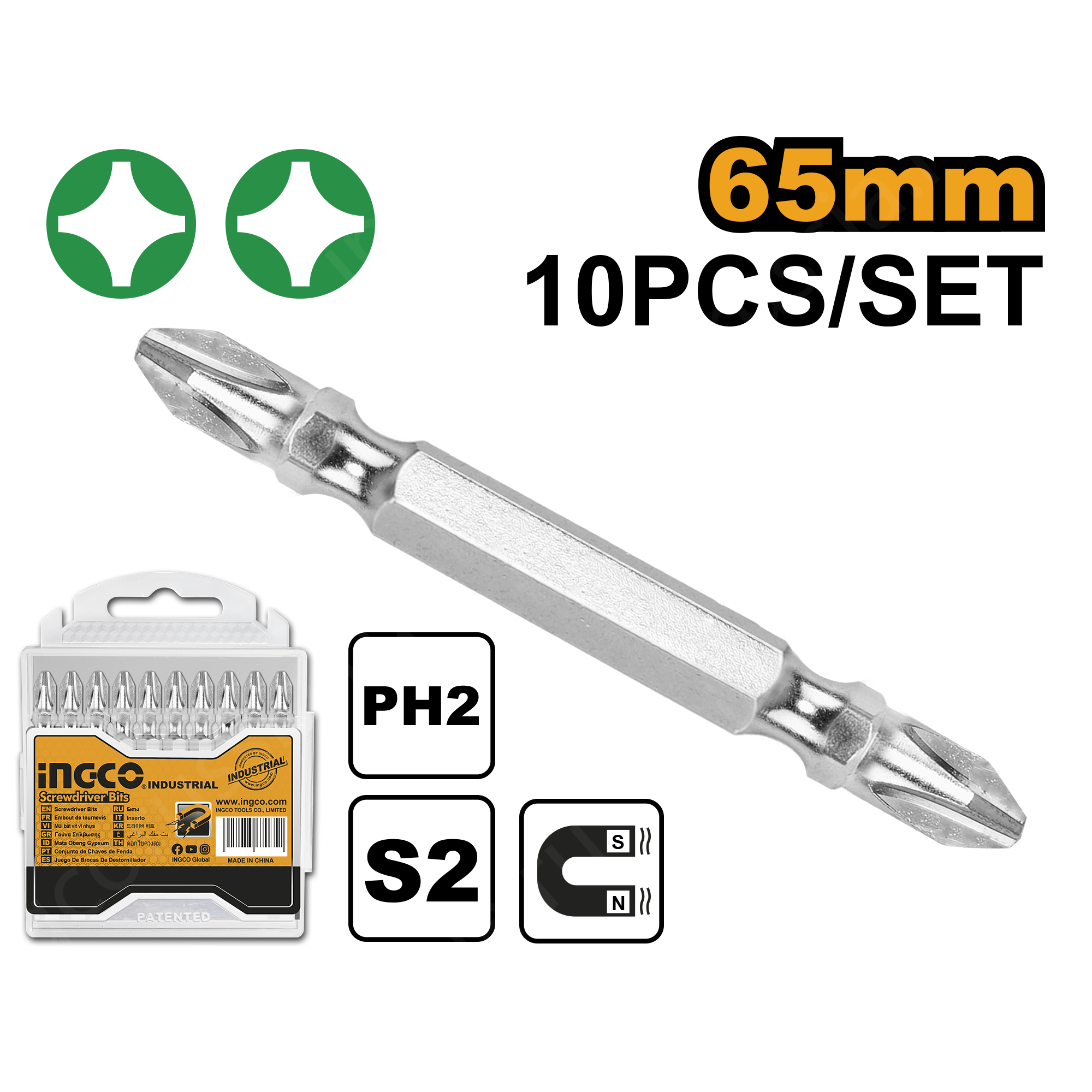 Набор двухсторонних бит PH2 10 шт INGCO SDB21PH233 INDUSTRIAL с шестигранным хвостовиком поставляется в пластиковом футляре.