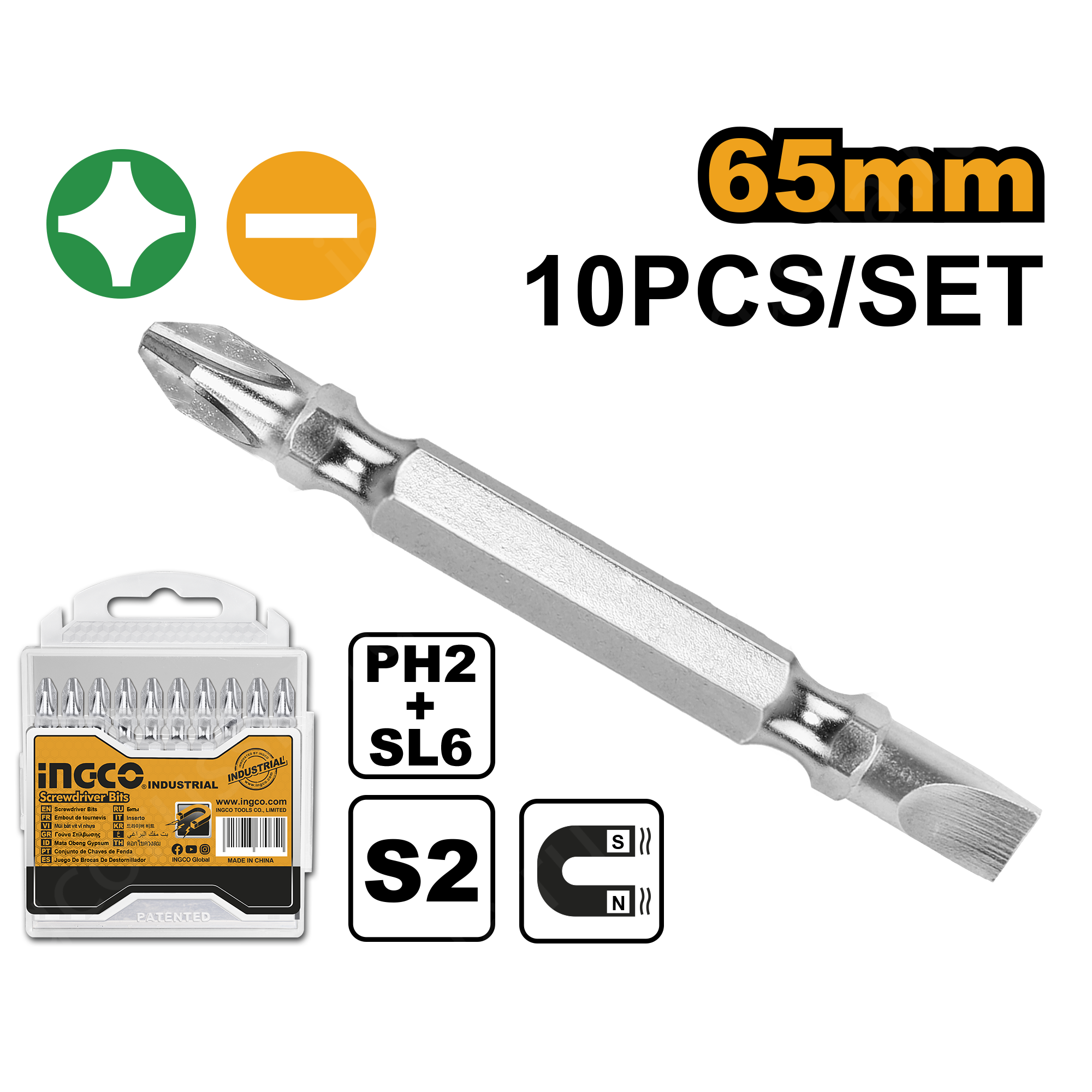 Набор двухсторонних бит PH2+SL6 10 шт INGCO SDB21HL133 INDUSTRIAL с шестигранным хвостовиком поставляется в пластиковом футляре.