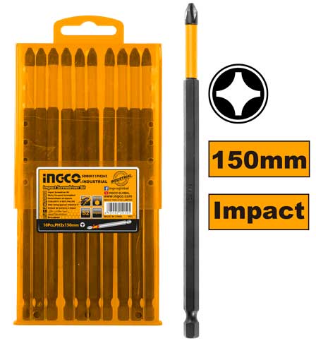 Набор ударных бит IMPACT РН2х200мм 10 шт. INGCO SDBIM11PH283 INDUSTRIAL с шестигранным хвостовиком поставляется в пластиковом футляре.