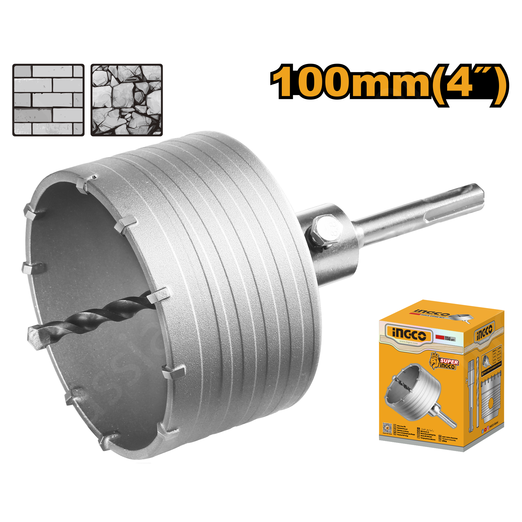 Коронка по бетону 100 мм SDS-Plus INGCO HCB1001 используется совместно с ударными дрелями и перфораторами для сверления отверстий в бетоне, кирпиче и камне.