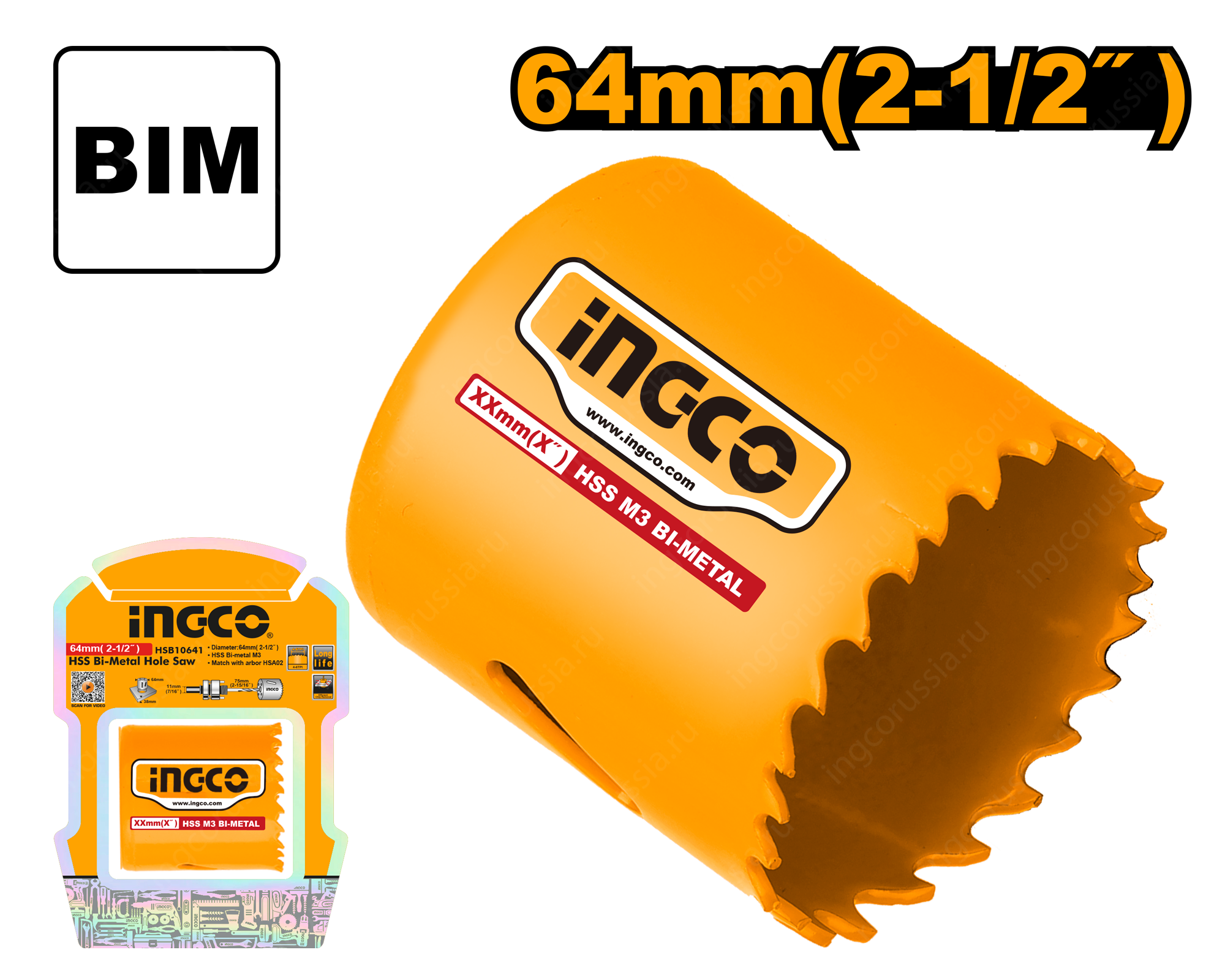 Коронка биметаллическая 64 мм INGCO HSB10641 предназначена для сверления отверстий в дереве, гипсакортоне и цветных металлах ALU, Cu, Ni, Ms, Zn пластике и прочих материалах.