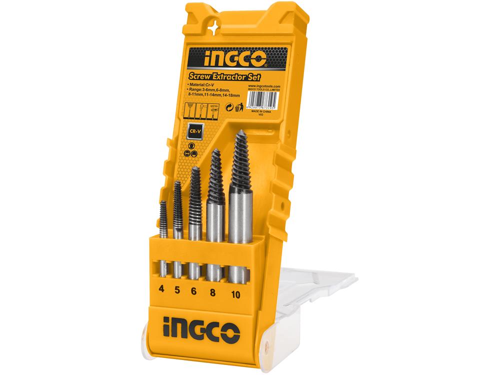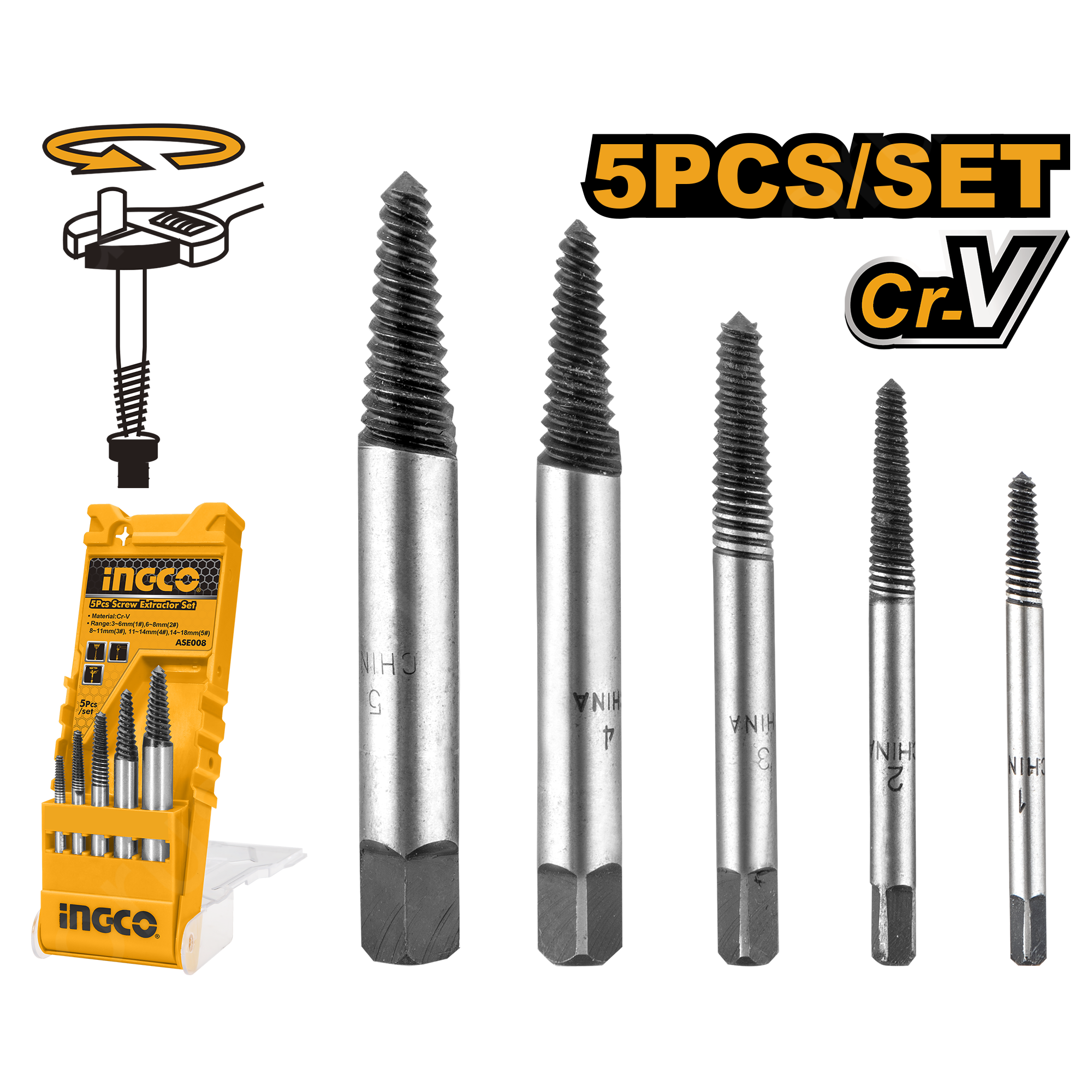 Набор экстракторов INGCO ASE008 состоит из 5 предметов, используемых для выполнения демонтажа сломанного крепежа. Материал - хромованадиевая сталь. Размеры: №1:3-6 мм; №2:6-8 мм; №3:8-11 мм; №4:11-14 мм; №5:14-19 мм. Упаковано в пластиковую коробку.