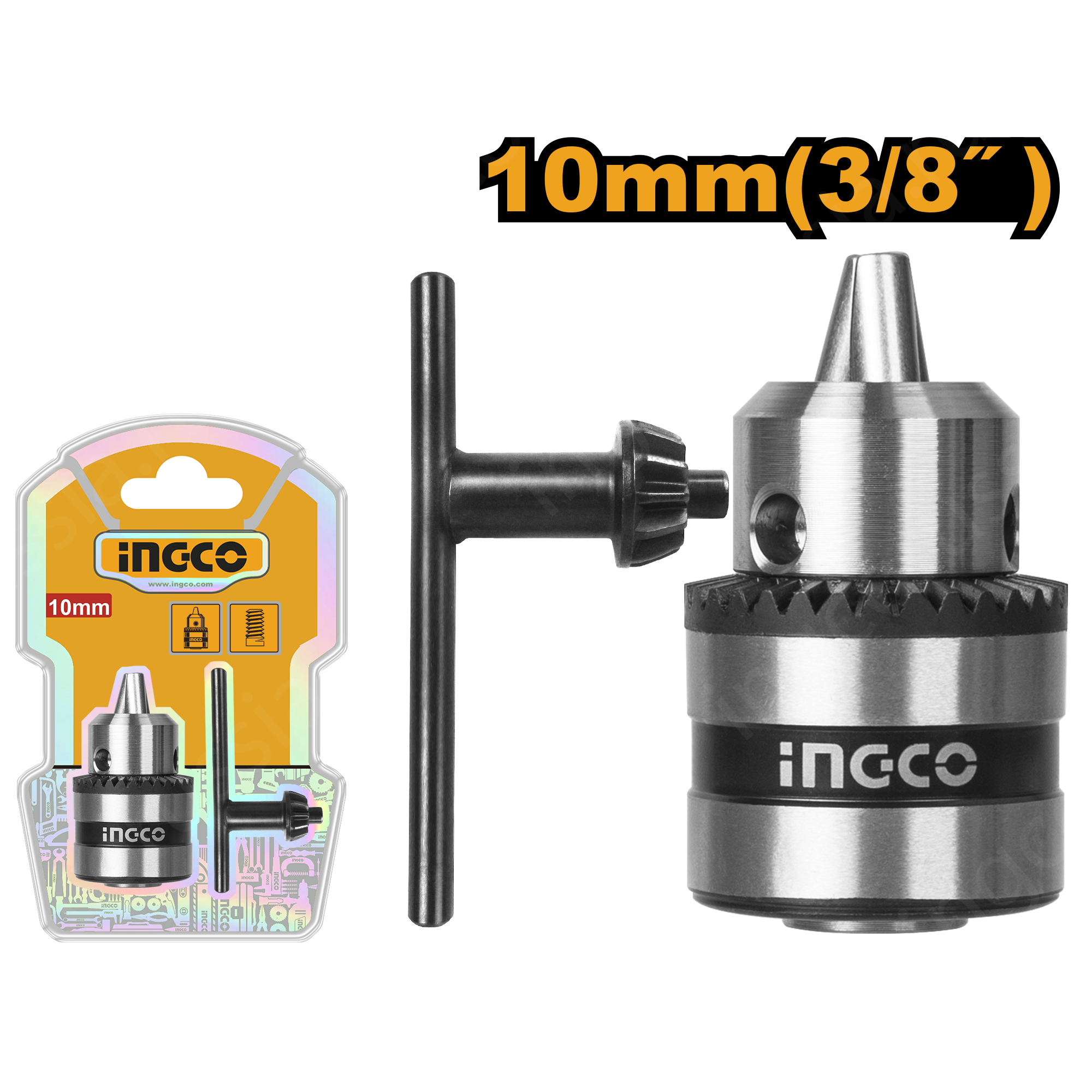 Патрон зажимной с ключом 10 мм INGCO KC1001 используется вместе с безударными и ударными дрелями, имеющими присоединительную резьбу 3/8"-24 UNF.
