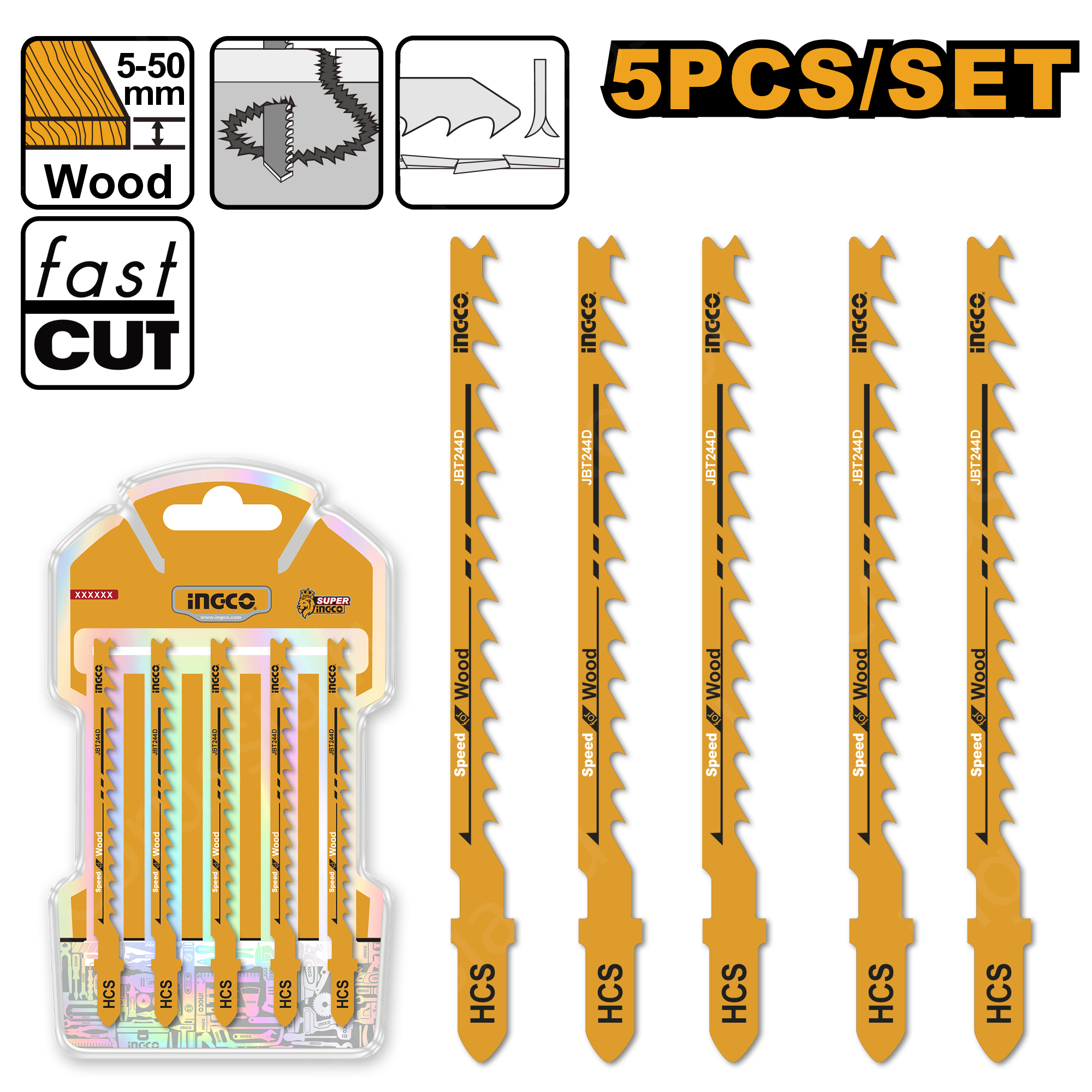 Набор пильных полотен по дереву INGCO JBT244D предназначен для работы по мягкой древесине (5-50 мм), ДСП, столярным плитам и ДВП, как рабочий элемент электролобзиков. Используются для выполнения криволинейных пропилов. Материал полотна - высокоуглеродистая сталь (HCS). Длина - 74 мм, 6 зубьев на дюйм. В комплекте 5 лезвий.