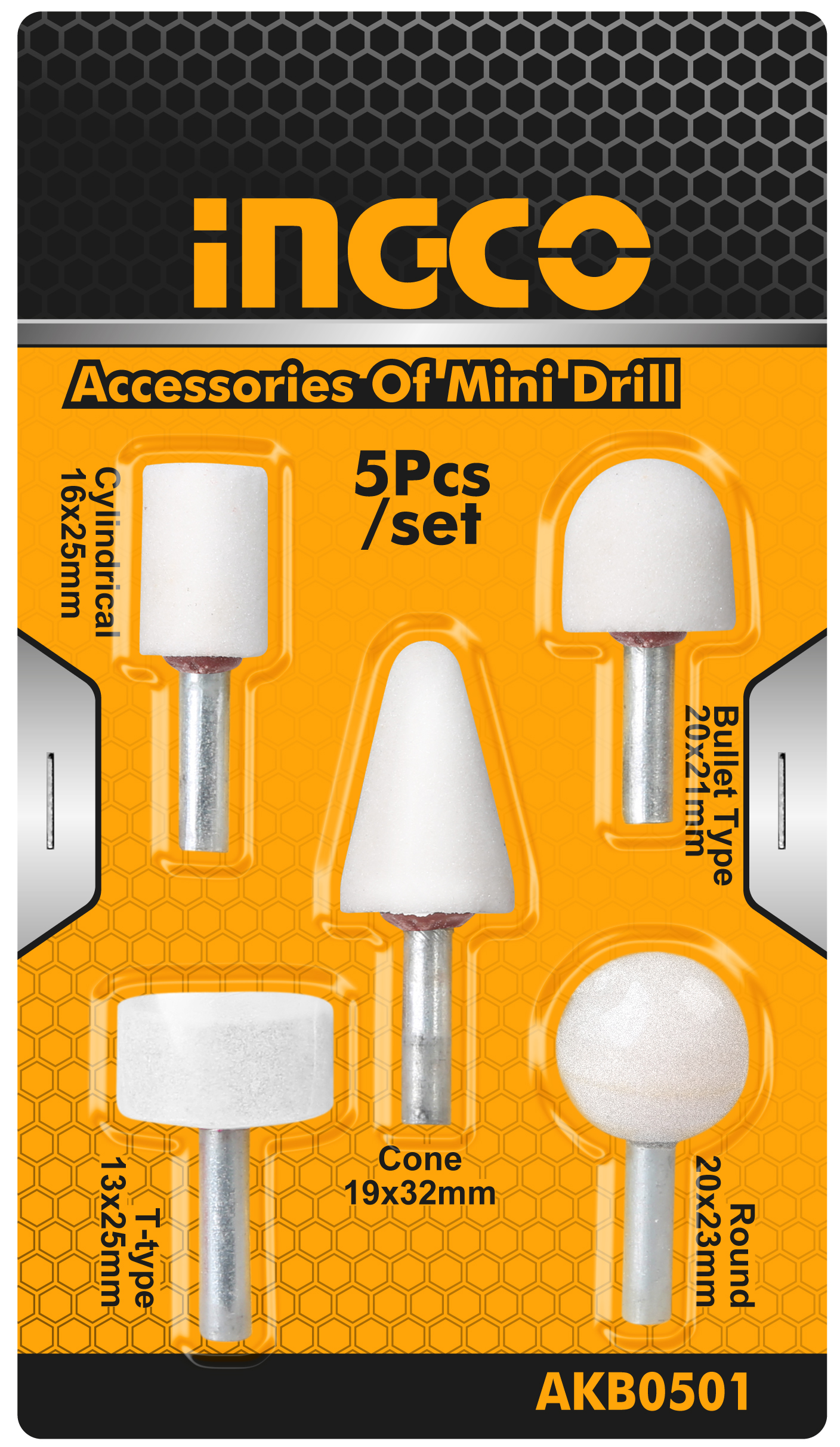 Набор насадок шлифовальных для гравера INGCO AKB0501 включает 5 шарошек абразивных: