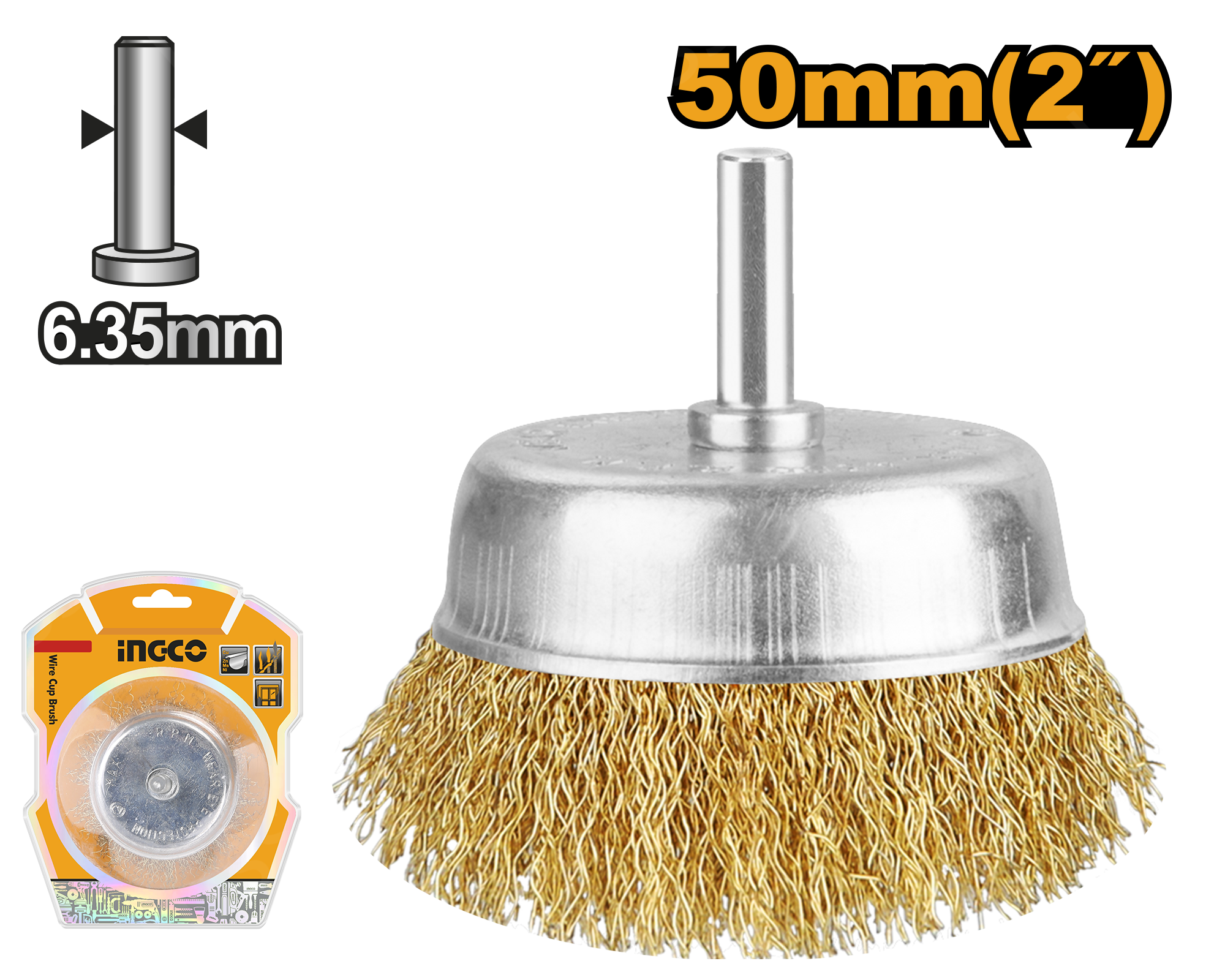 Щетка чашеобразная проволочная INGCO WB30501 применяется совместно с дрелями и предназначена для снятия лака, краски, зачистки от ржавчины металлических поверхностей и изделий. Рабочая часть состоит из стальной проволоки диаметром 0,35 мм. Диаметр чашки - 50мм (2"). Диаметр хвостовика: 6,35мм (1/4")