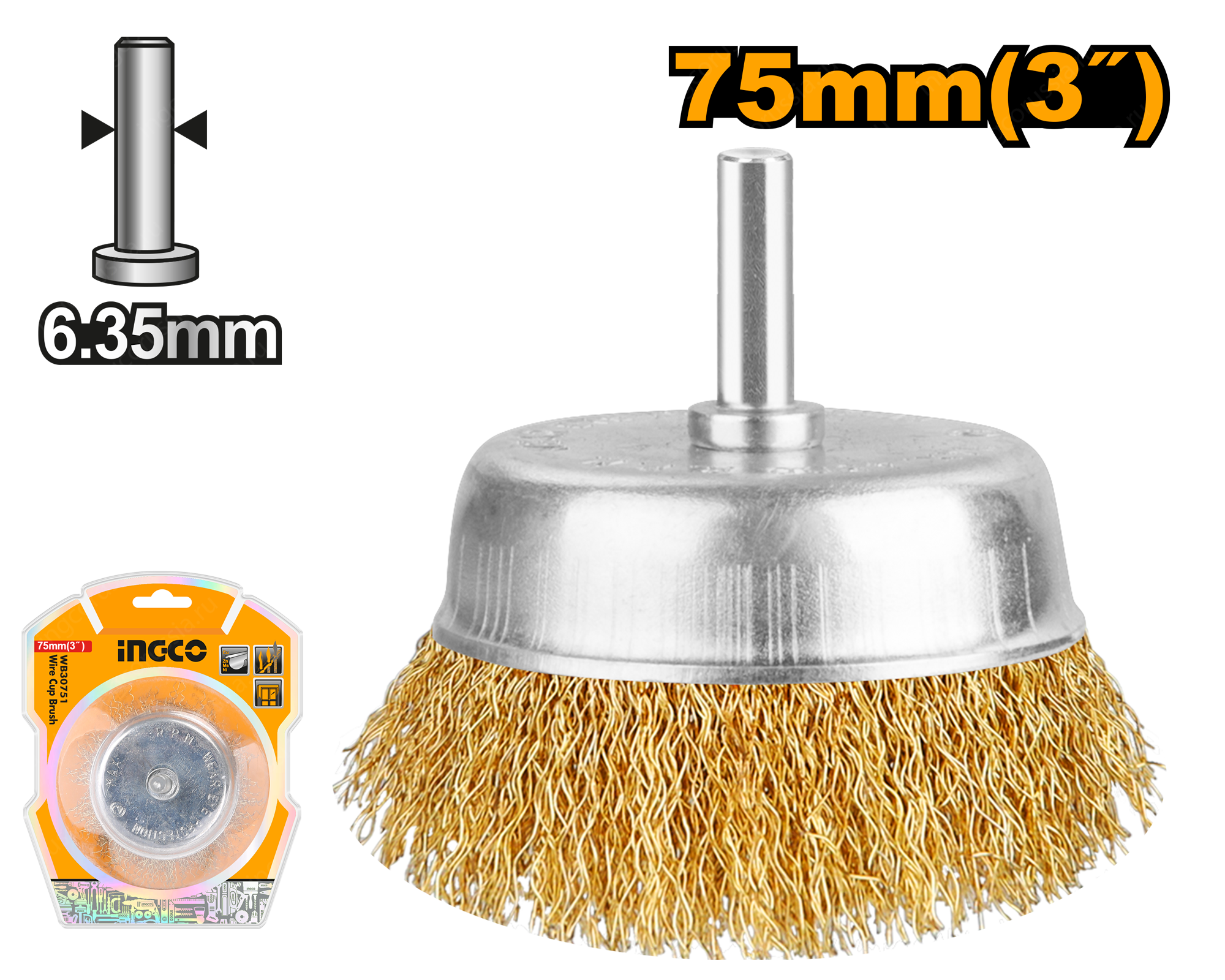 Щетка чашеобразная проволочная INGCO WB30751 применяется совместно с дрелями и предназначена для снятия лака, краски, зачистки от ржавчины металлических поверхностей и изделий. Рабочая часть состоит из стальной проволоки диаметром 0,35 мм. Диаметр чашки - 75 мм (3"). Диаметр хвостовика: 6,35мм (1/4")