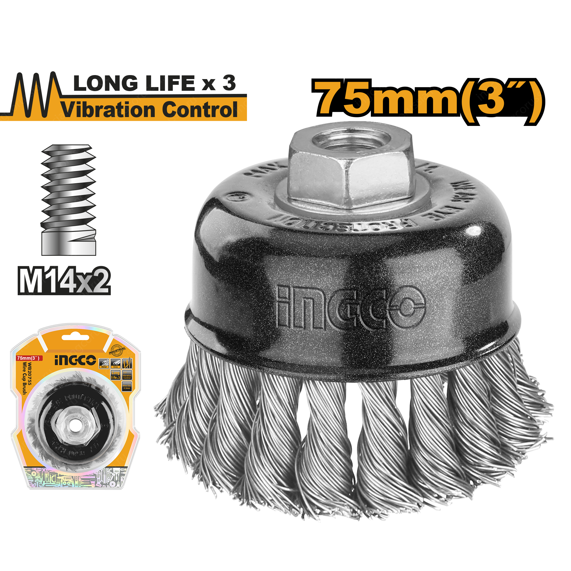Чашечная щетка плетеная М14 для УШМ 75х0,5мм INGCO WB20755 INDUSTRIAL применяется совместно с угловыми шлифовальными машинами и предназначена для снятия лака, краски, зачистки от ржавчины металлических поверхностей и изделий.