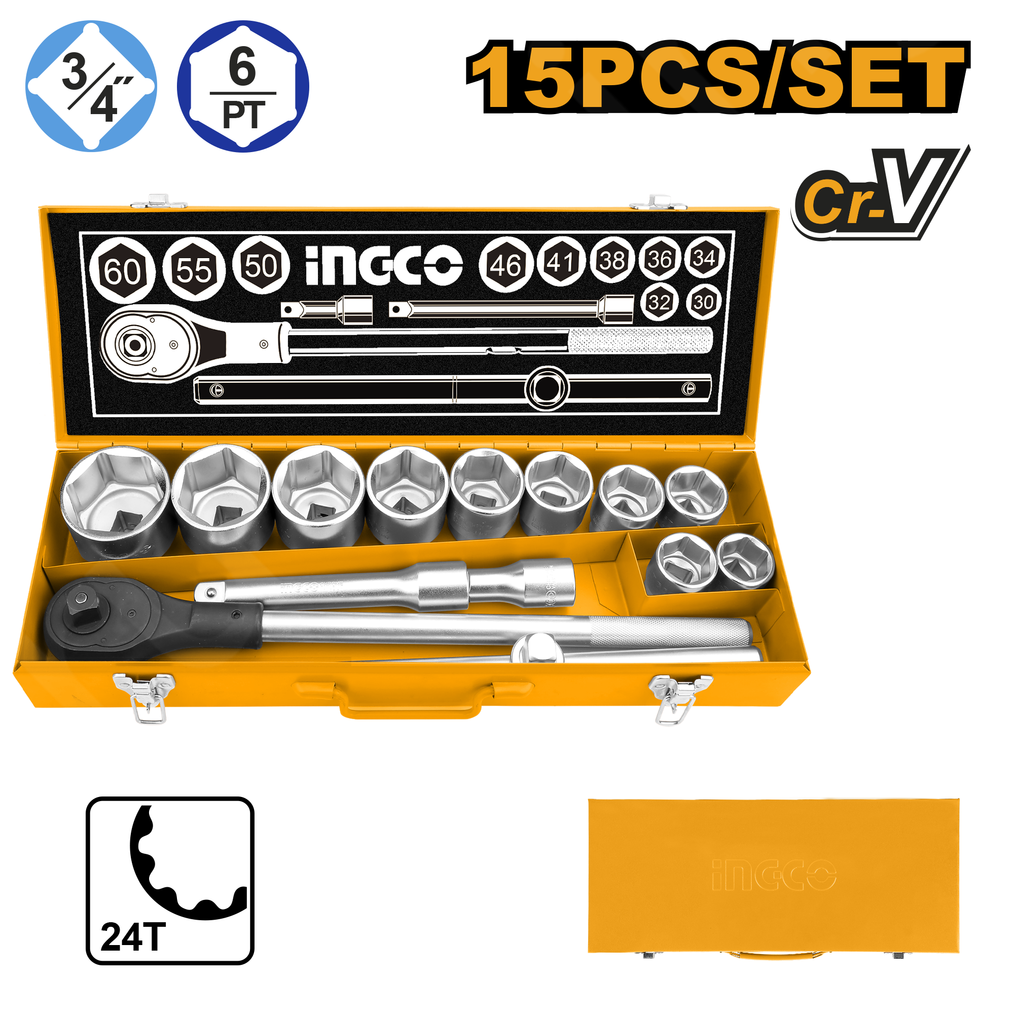 - Торцевые шестигранные головки 3/4": 30, 32, 34, 36, 38, 41, 46, 50, 55, 60 мм - 10 шт.