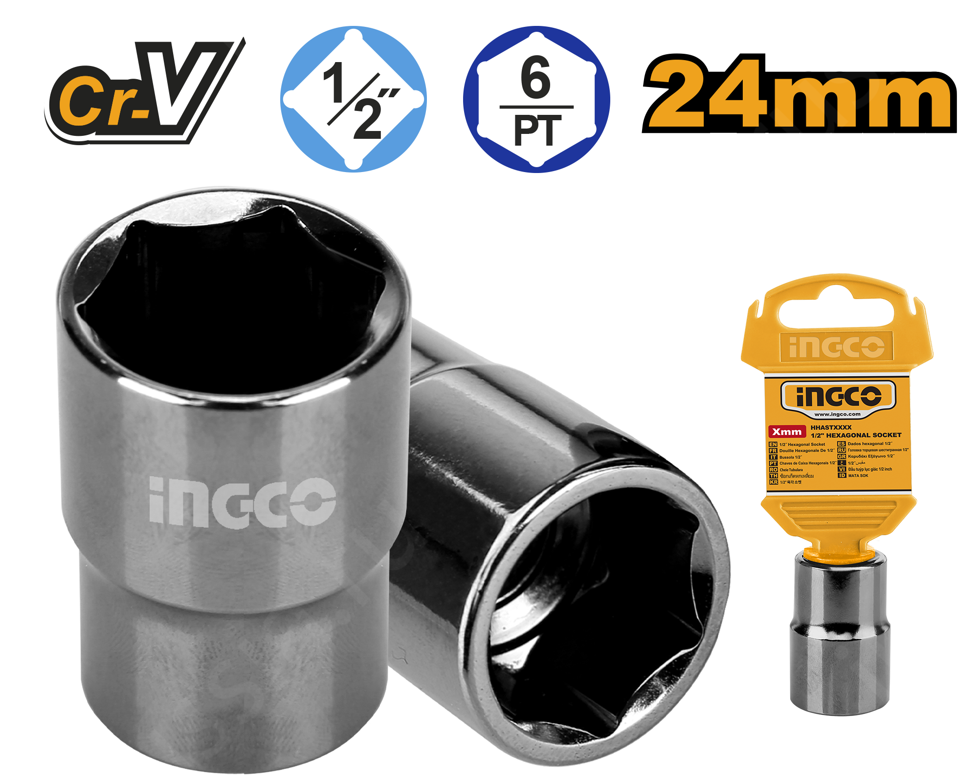 Головка торцевая шестигранная 1/2", 24мм INGCO HHAST12241 INDUSTRIAL используется совместно с приводами и удлиннителями для монтажа или демонтажа резьбовых соединений.