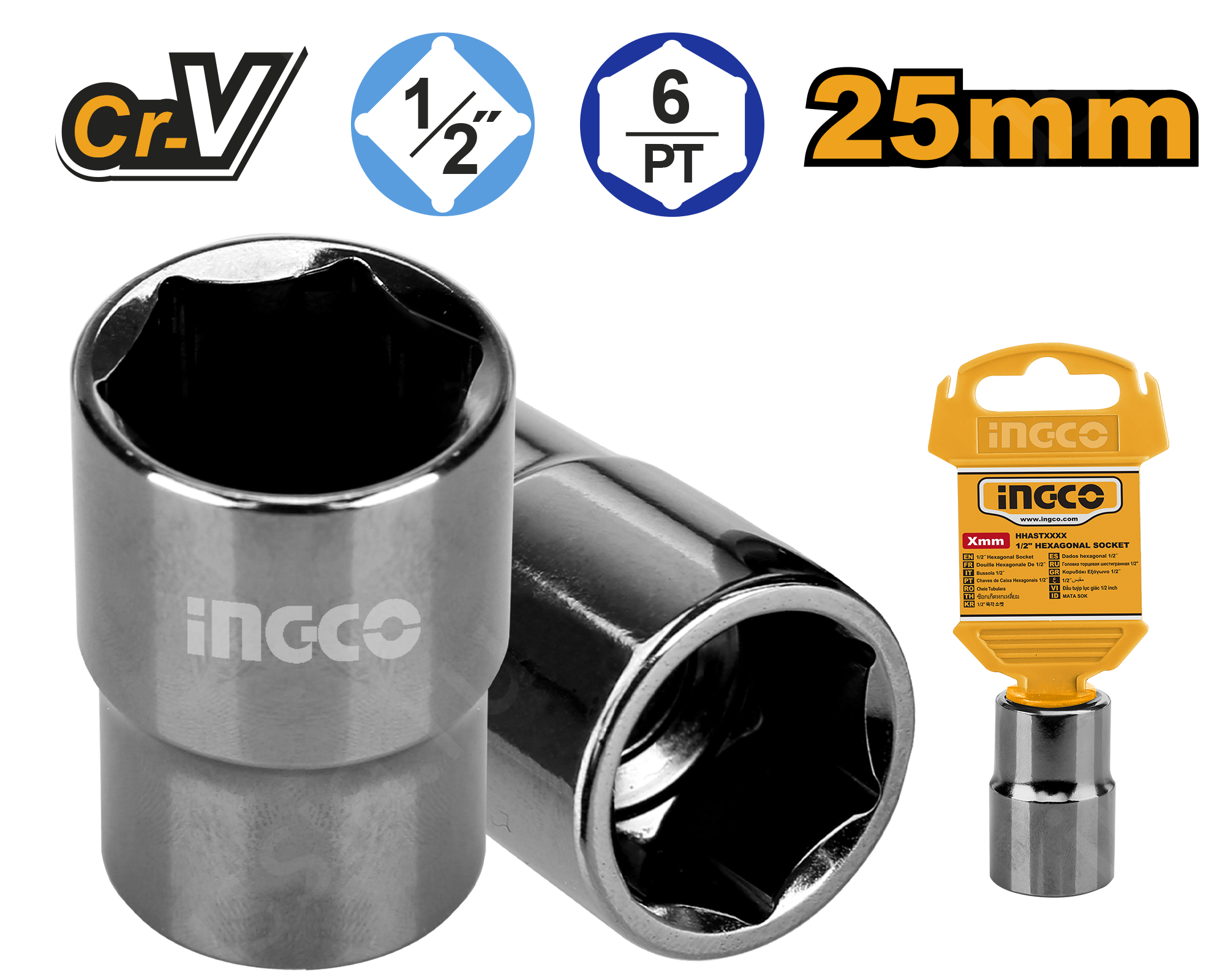 Головка торцевая шестигранная 1/2", 25мм INGCO HHAST12251 INDUSTRIAL используется совместно с приводами и удлиннителями для монтажа или демонтажа резьбовых соединений.