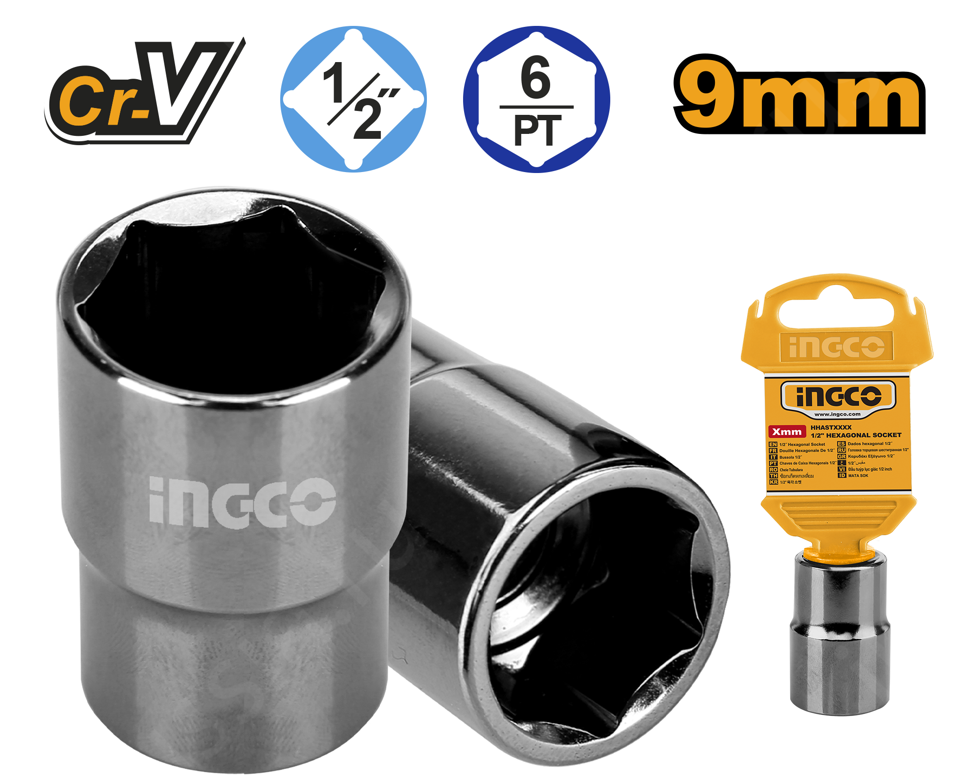 Головка торцевая шестигранная 1/2", 9мм INGCO HHAST12091 INDUSTRIAL используется совместно с приводами и удлиннителями для монтажа или демонтажа резьбовых соединений.