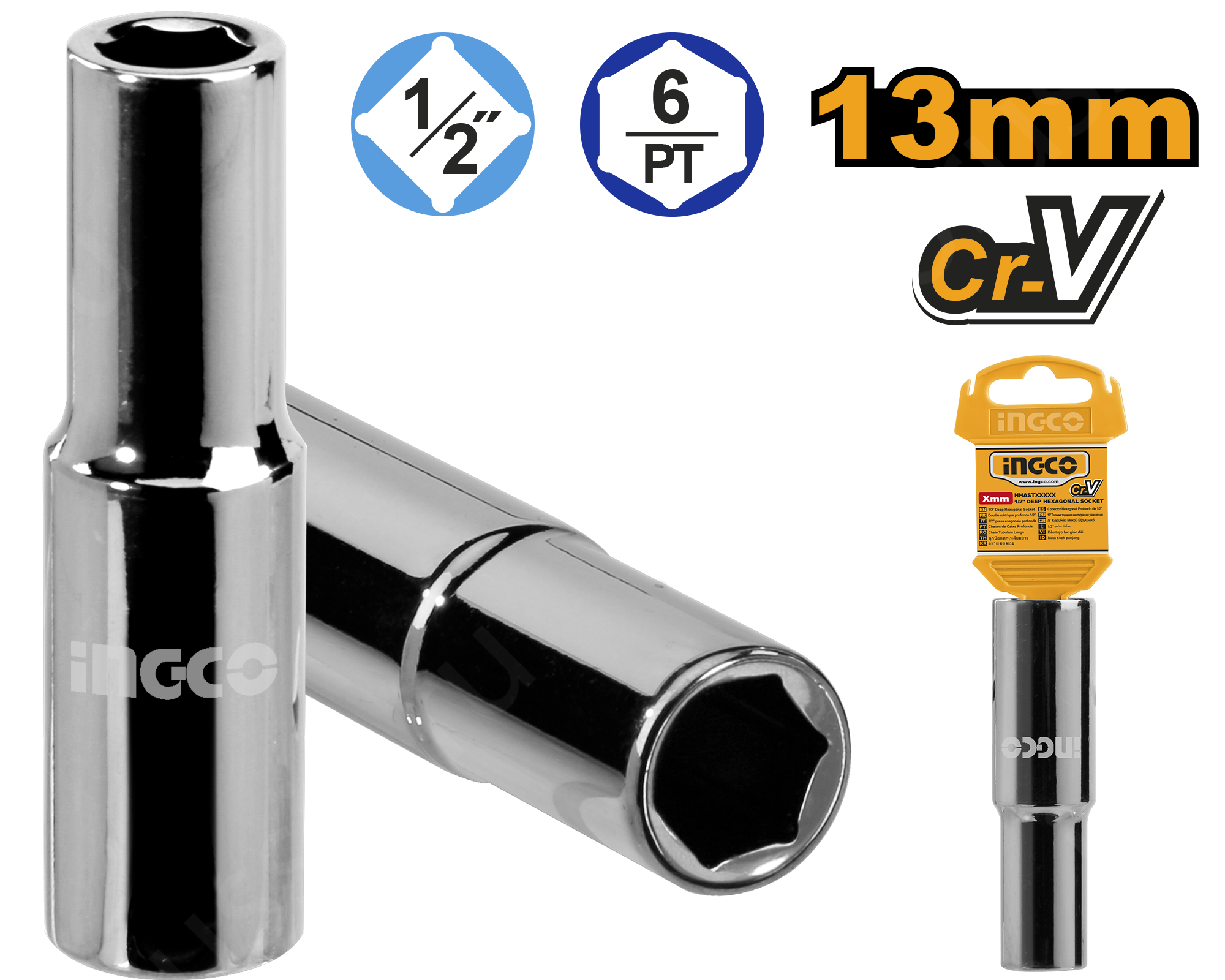 Головка торцевая шестигранная удлиненная 1/2", 13мм INGCO HHAST12133L INDUSTRIAL используется совместно с приводами и удлиннителями для монтажа или демонтажа резьбовых соединений.