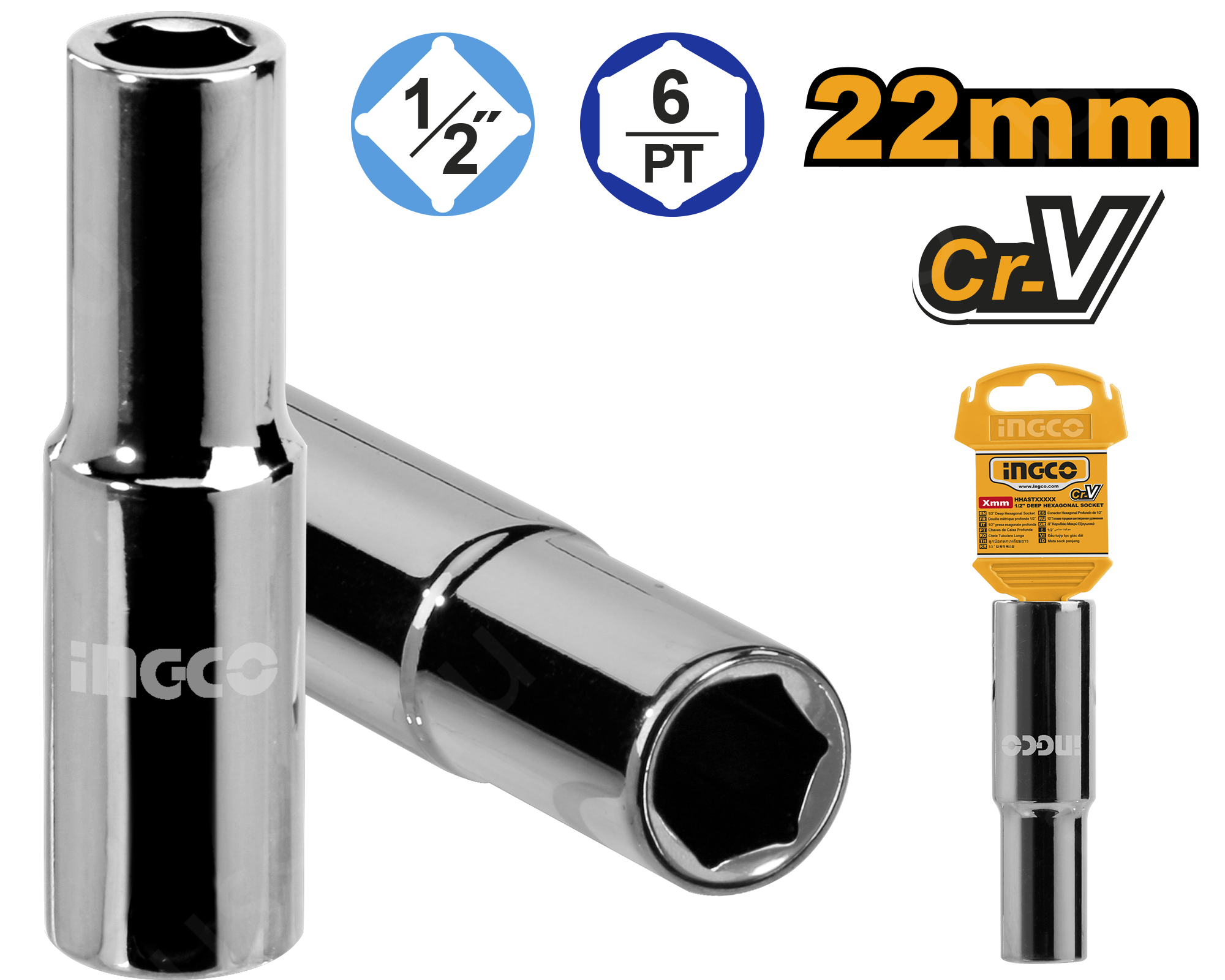 Головка торцевая шестигранная удлиненная 1/2", 22мм INGCO HHAST12223L INDUSTRIAL используется совместно с приводами и удлиннителями для монтажа или демонтажа резьбовых соединений.
