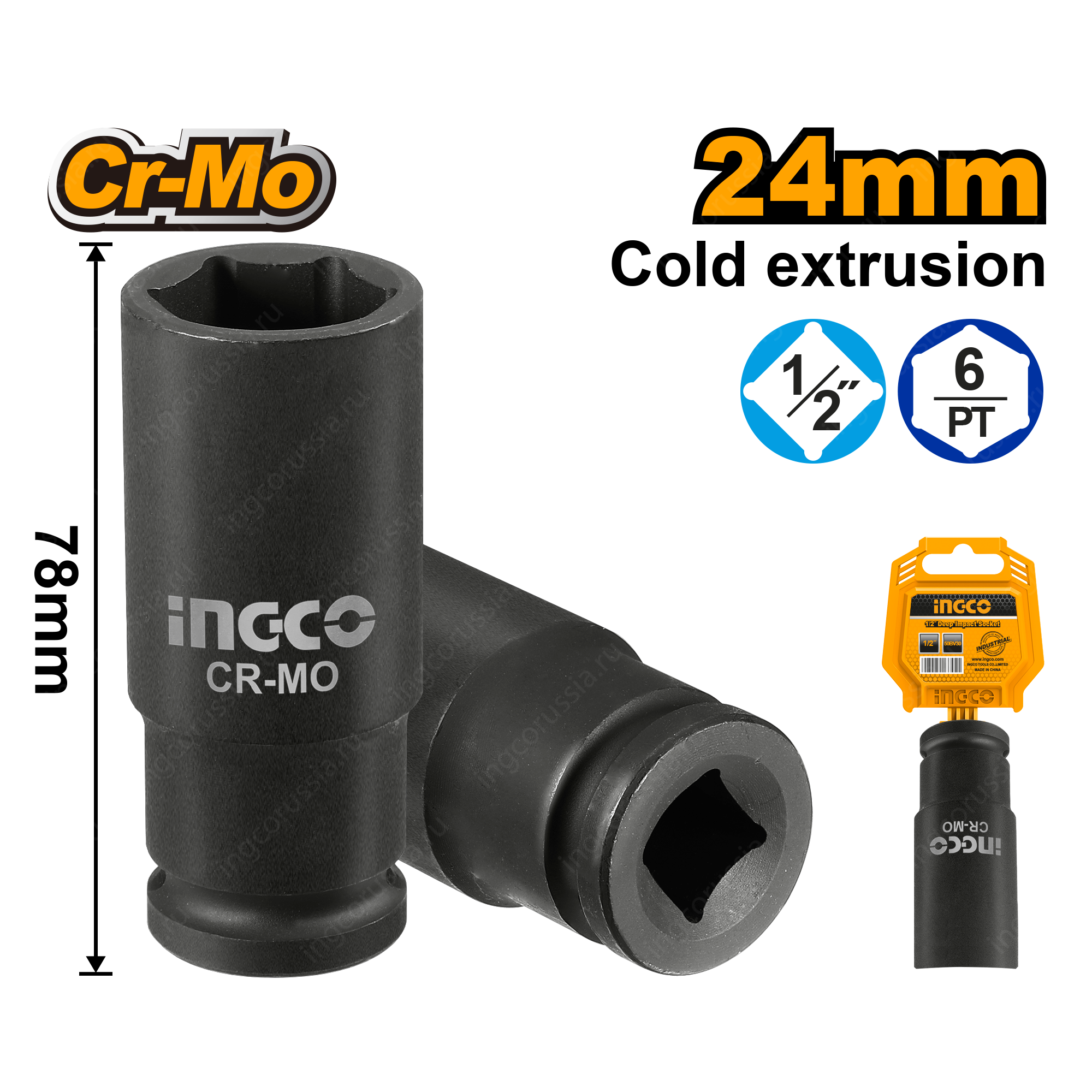 Головка торцевая ударная 1/2", 24мм INGCO HDIS12241L INDUSTRIAL используется совместно с приводами и удлиннителями для монтажа или демонтажа резьбовых соединений.