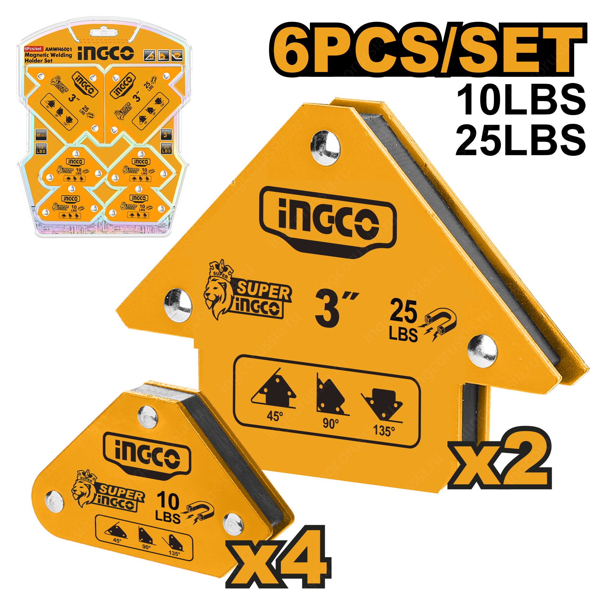 Набор угольников магнитных для сварки Углы: 45 °, 90 °, 135 ° INGCO AMWH6001 приспособление используется для фиксации металлических деталей при сварке, пайке или сборке конструкций.