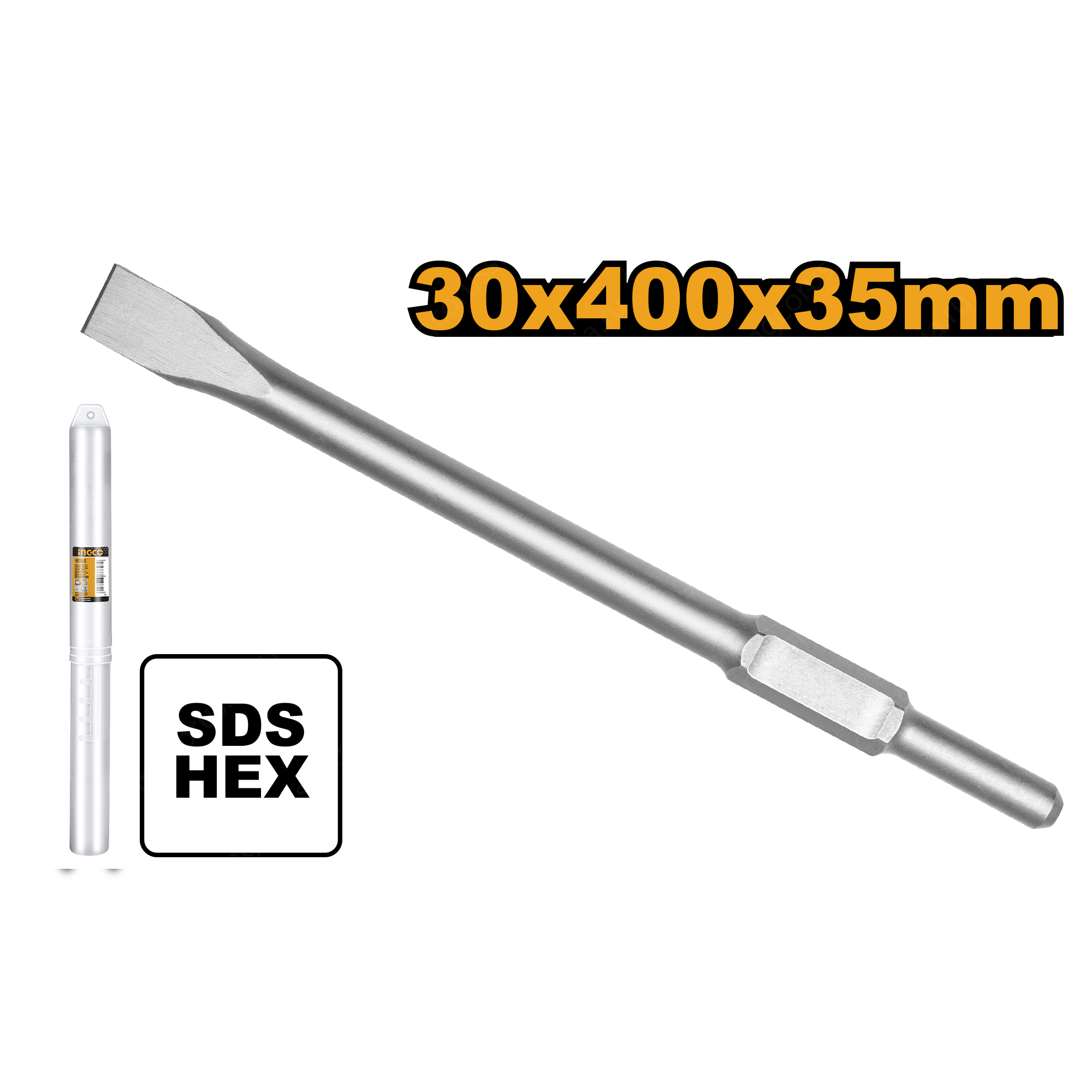 Зубило плоское HEX 30x410х40 мм INGCO DBC0324102 применяется совмесно с отбойными молотками, имеющими тип крепления HEX.