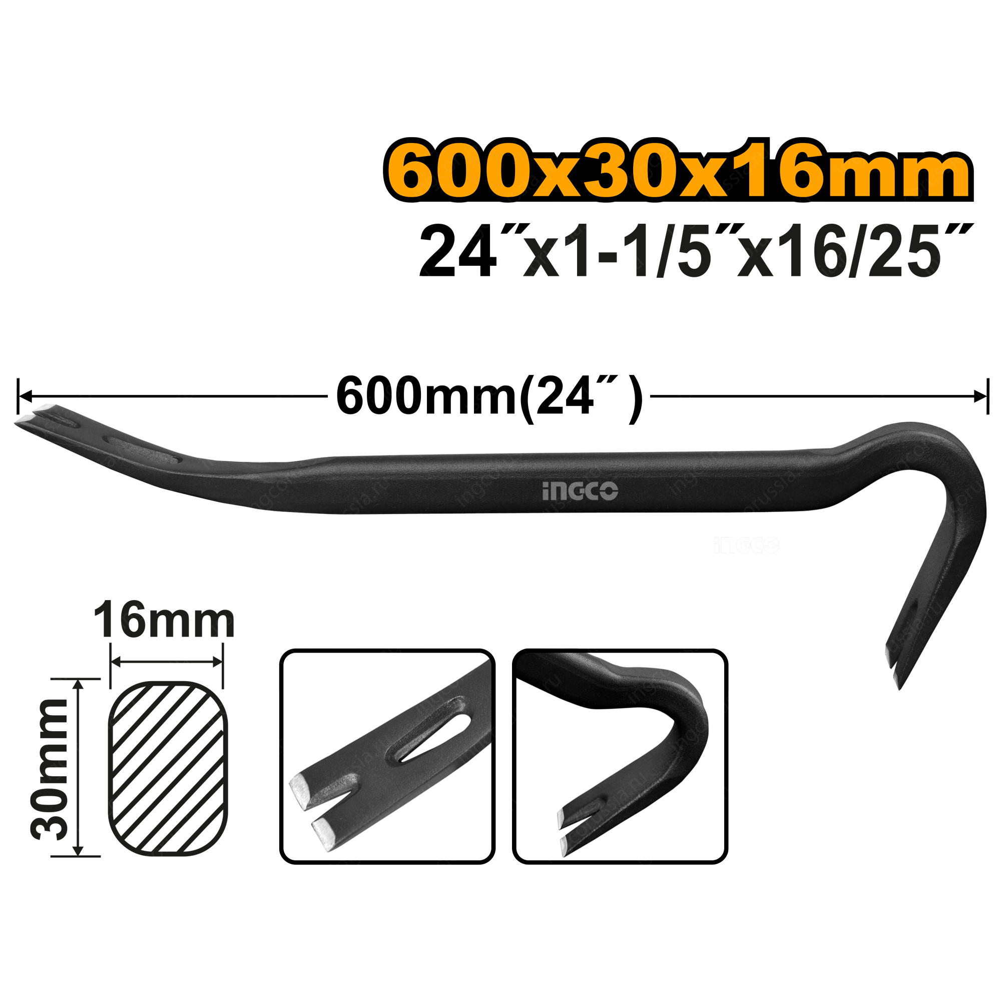 Лом-гвоздодер 600 мм INGCO HWBA01242 INDUSTRIAL используется при строительных и монтажных работах.