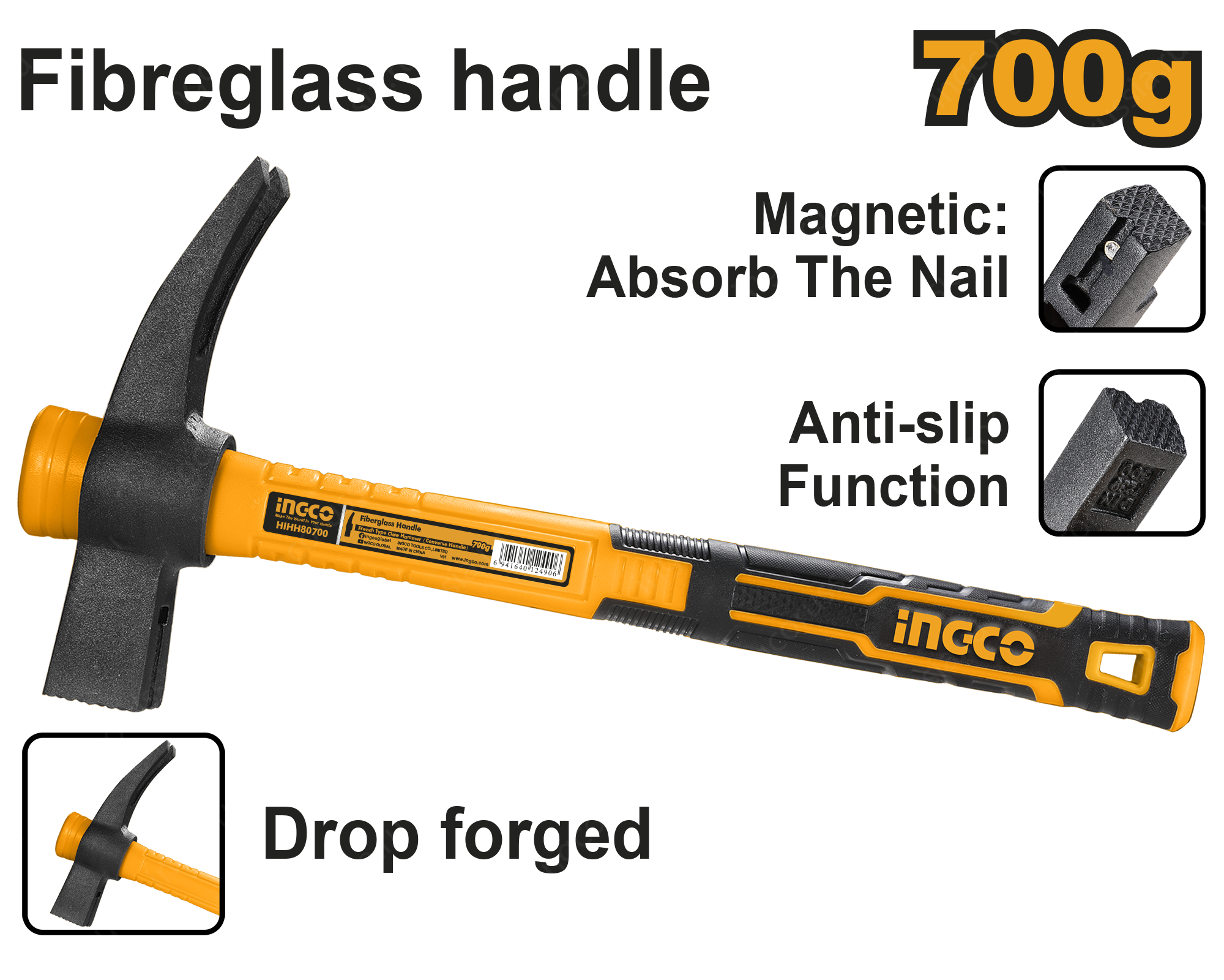 Молоток-гвоздодер-кирка 700 гр. INGCO HIHH80700 - представляет собой ручной ударный инструмент, который широко используется для столярных работ. Он оснащен рифленым бойком и гвоздодером.