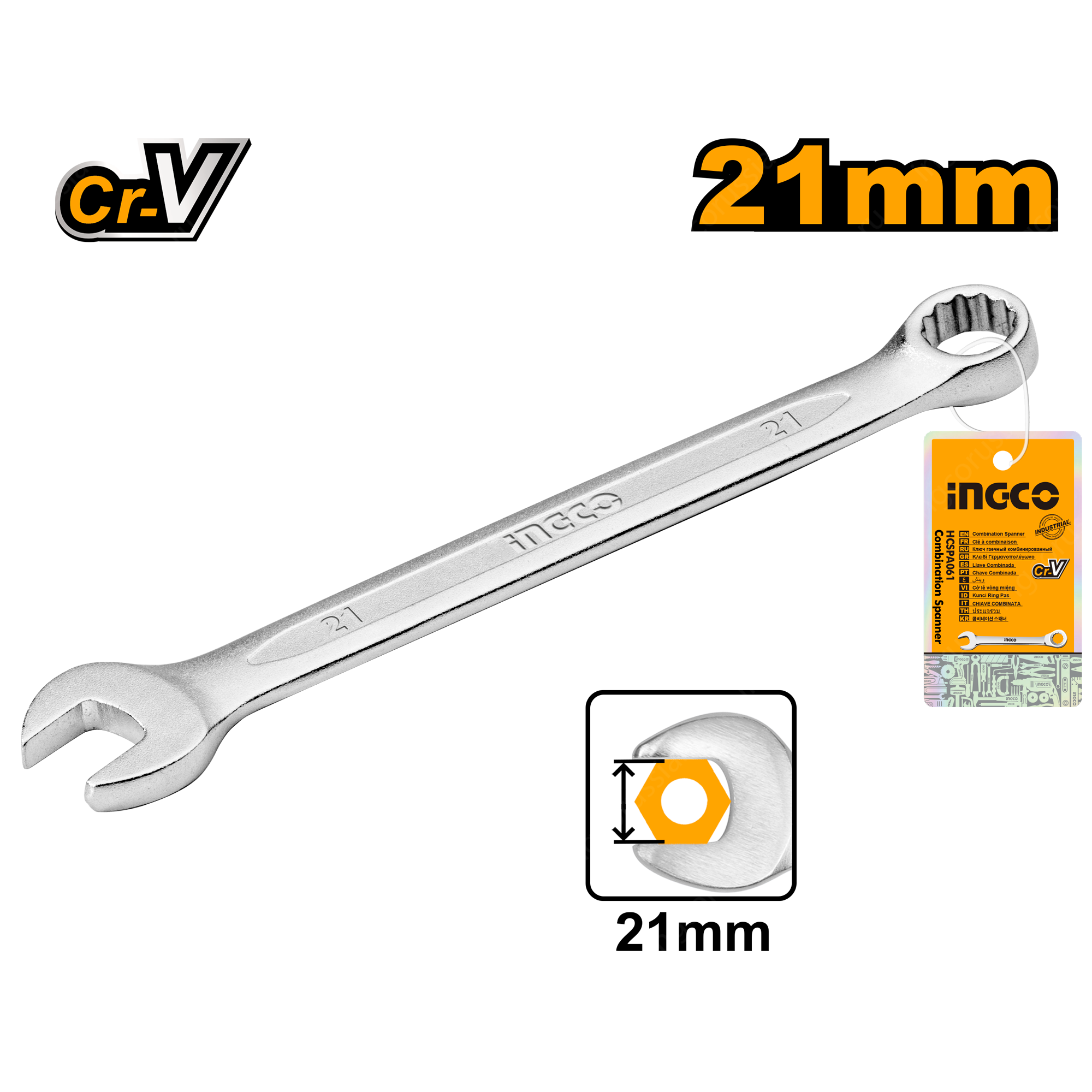 Комбинированный ключ 21 мм INGCO HCSPA211 INDUSTRIAL - ручной инструмент, совмещающий в себе накидной и рожковый вид ключа.