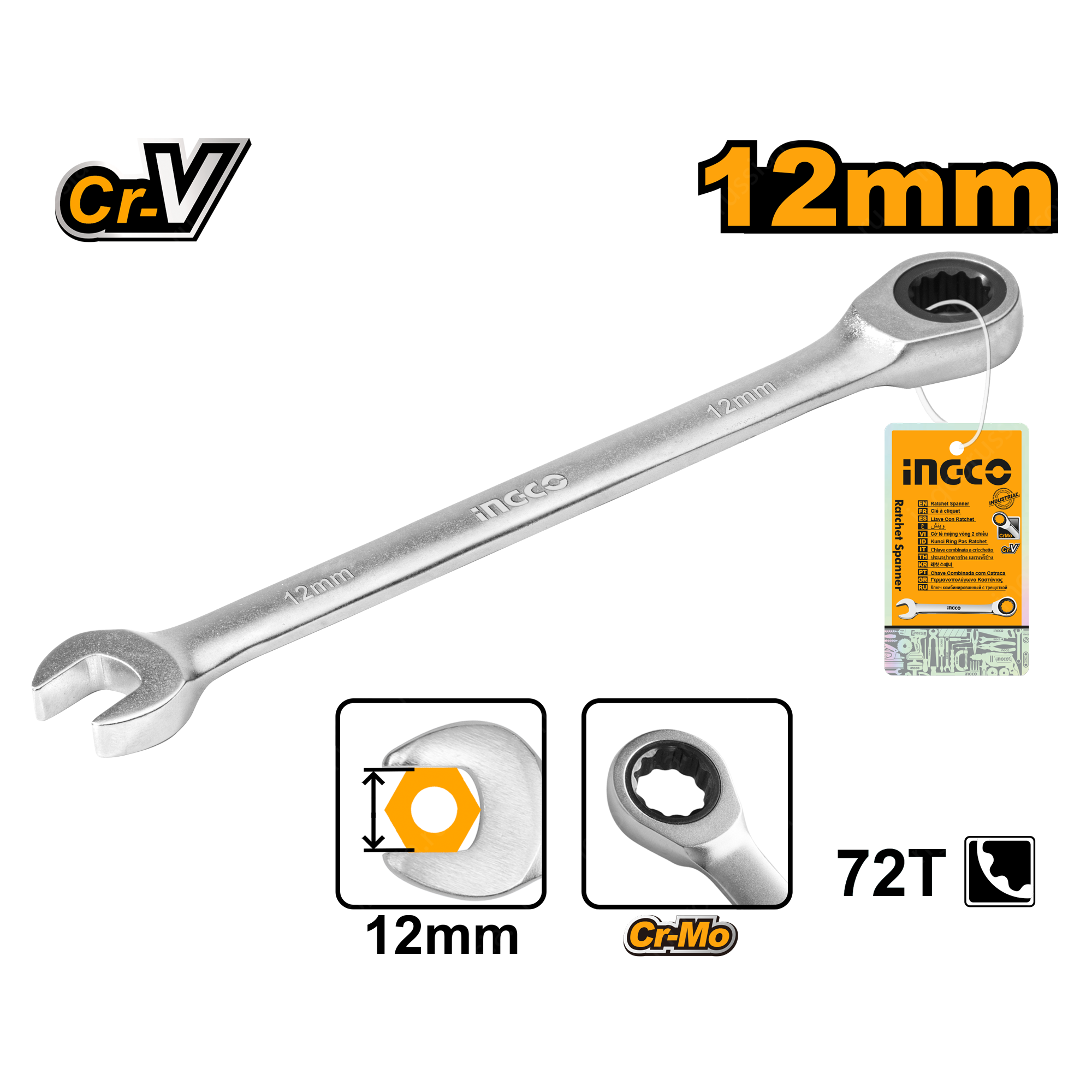Комбинированный трещоточный ключ 12 мм INGCO HCSPAR121 INDUSTRIAL - ручной инструмент, совмещающий в себе накидной и рожковый вид ключа с трещоточным механизмом для закручивания и затягивания крепежа.