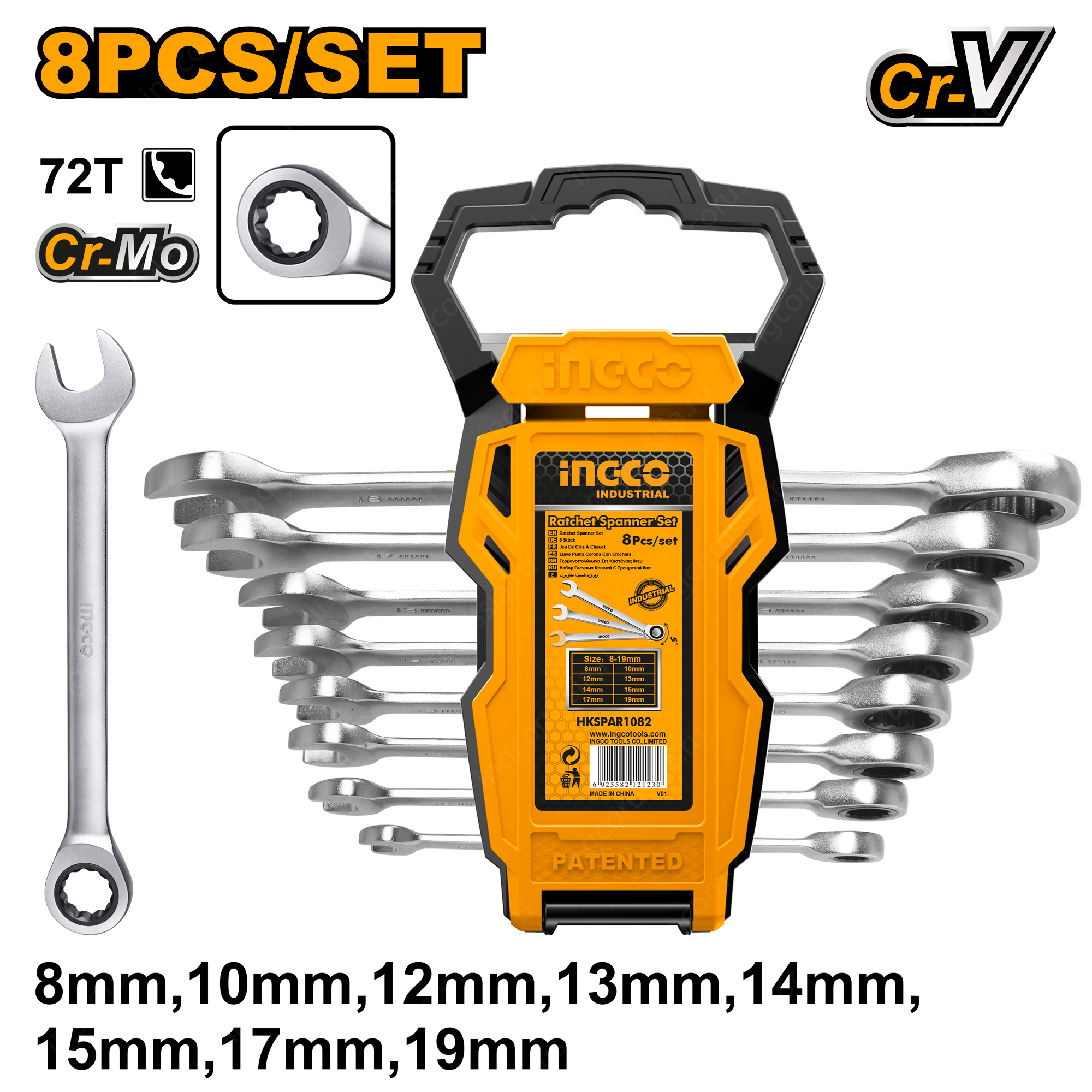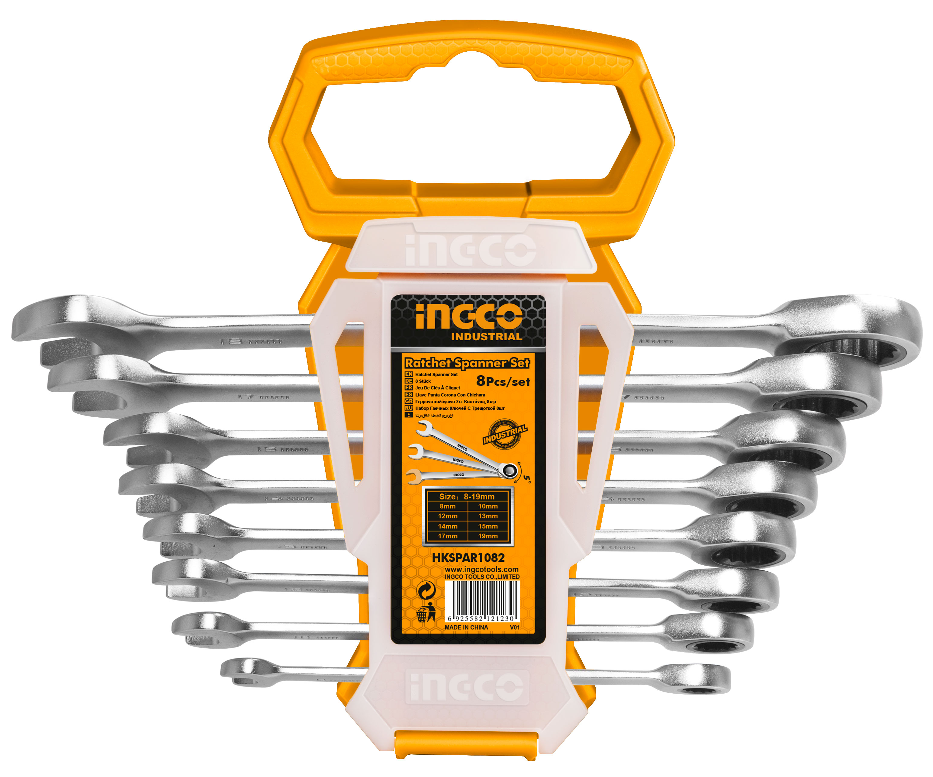 <p>Набор комбинированных гаечных ключей с трещоткой INGCO HKSPAR1082 предназначен для проведения ремонтных, сборочных и демонтажных работ с использованием шестигранного крепежа.</p> <ul> <li>Включает в себя 8 ключей с двумя головками - рожковой и кольцевой с трещоточным механизмом.</li> <li>Материал инструментов - хромованадиевая сталь, трещотка выполнена из прочного хроммолибденового сплава.</li> <li>Размеры: 8 мм, 10 мм, 12 мм, 13 мм, 14 мм, 15 мм, 17 мм, 18 мм. </li> </ul> <p><strong>Вес: Брутто - 1кг.</strong></p> <p><strong>Параметры упакованного товара: Длина-24см., Ширина-20см., Высота-3см.<sup><sub> </sub></sup></strong></p>