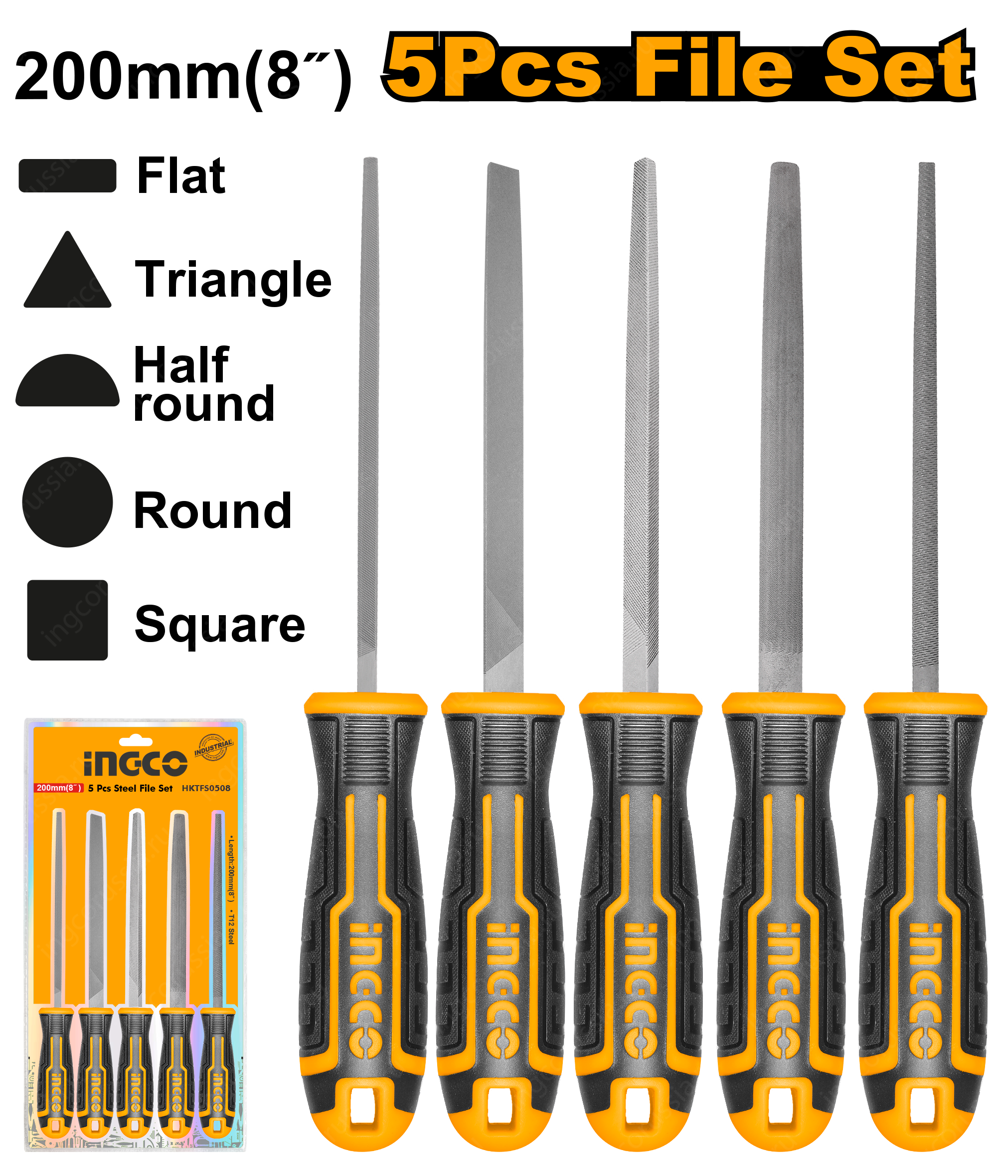 <p>Набор напильников INGCO HKTFS0508 INDUSTRIAL обеспечивает эффективную обработку деталей и заготовок из металла. Инструменты подходят для опила плоских и вогнутых поверхностей, пазов, фасок, кромок и выступов, а также обрезки заусенцев. В наборе напильники плоской, полукруглой, круглой, треугольной и квадратной формы.</p> <p>Длина: 200 мм. Материал рабочей части: сталь Т12. Материал рукояток: TPR пластик.</p> <p>Сечение соответствует ГОСТ 1465-80 (GB 5805 -1986 стандар КНР) - №2 </p> <p><strong>Вес: Брутто - 0,85 кг.</strong></p> <p><strong>Параметры упакованного товара: Длина-45 см., Ширина-21 см., Высота-4 см.<sup><sub> </sub></sup></strong></p>