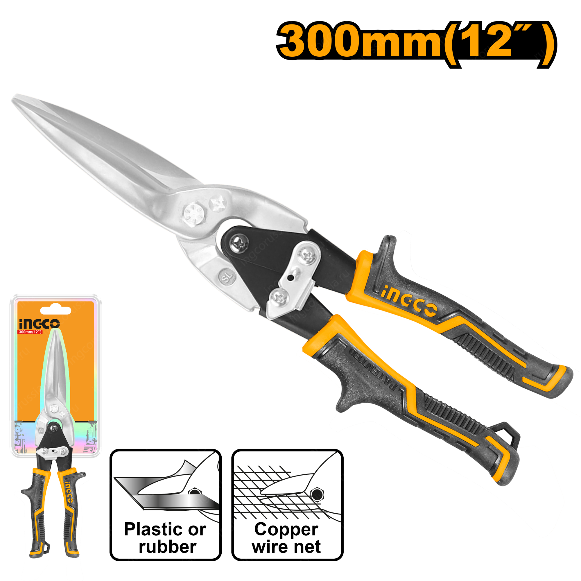 Универсальные ножницы по металлу 300 мм INGCO HTSN0112S - удобный ручной инструмент, который подойдет для резки пластика, резины, а также 0,5 мм латунной проволоки.