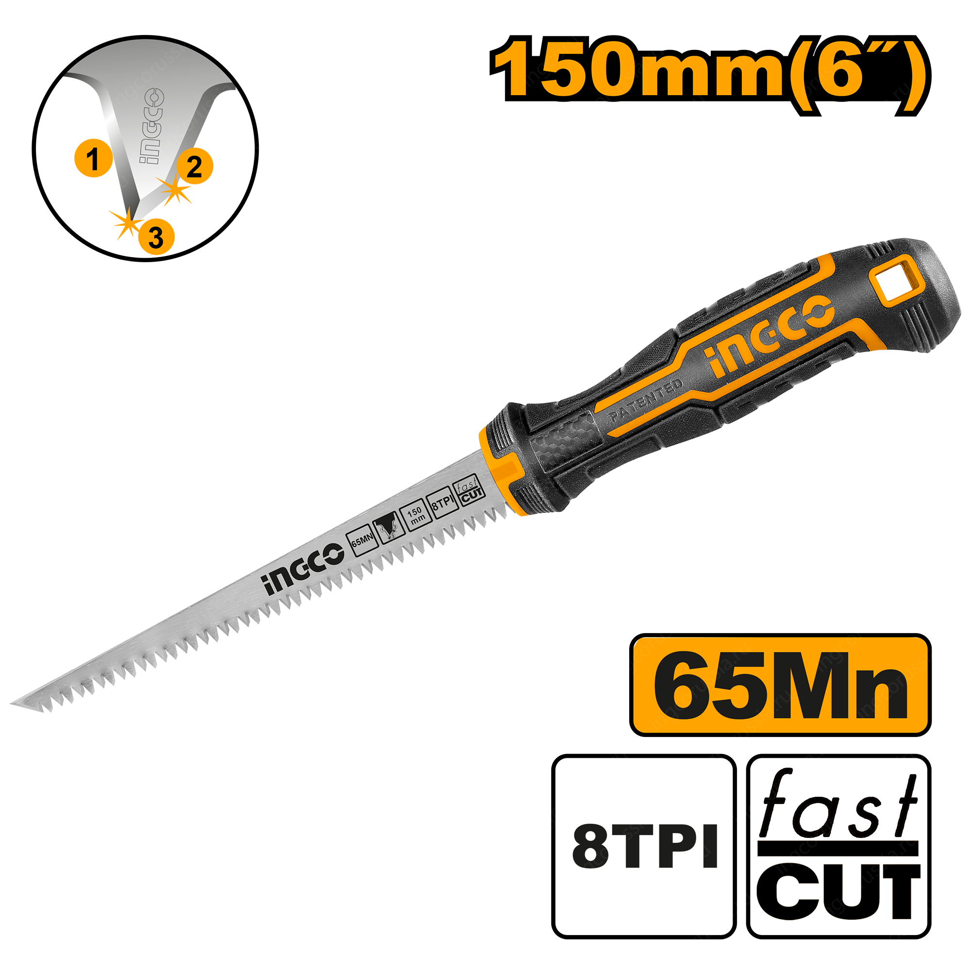 Ножовка по гипсокартону INGCO HWBSW628C изготовлена из углеродистой стали марки 65Mn, которая известна благодаря своей прочности и хорошо держит заточку. Наличие узкого полотна позволяет выпиливать окружности небольшого диаметра.