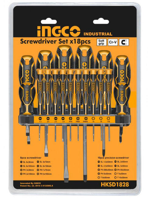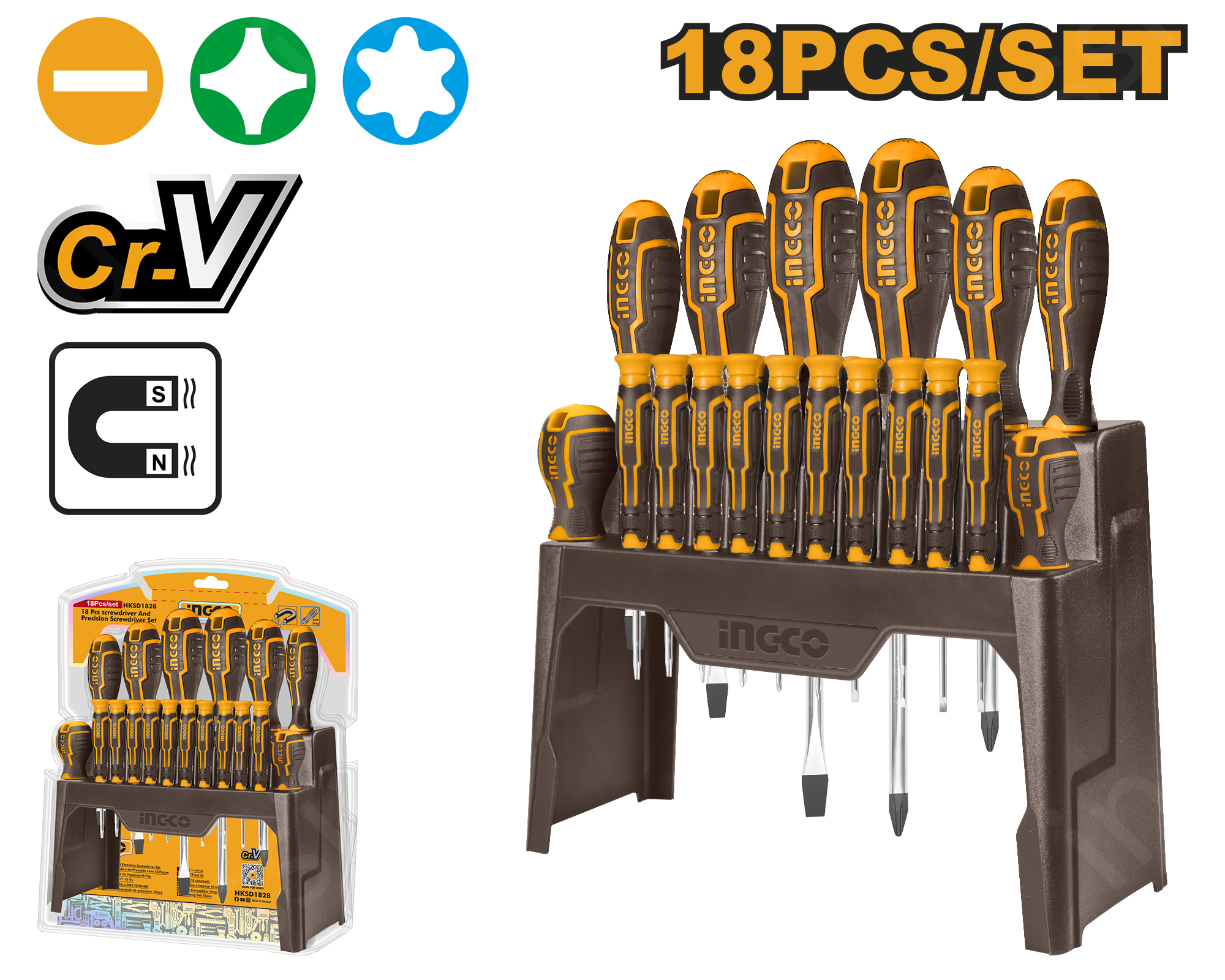 Универсальный набор отверток 18 шт INGCO HKSD1828 предназначен для работ с крепежом. Имеет в комплекте 8 отверток и 10 прецизионных отверток с разным шлицем для точных работ с крепежом на платах и деталях электроники.