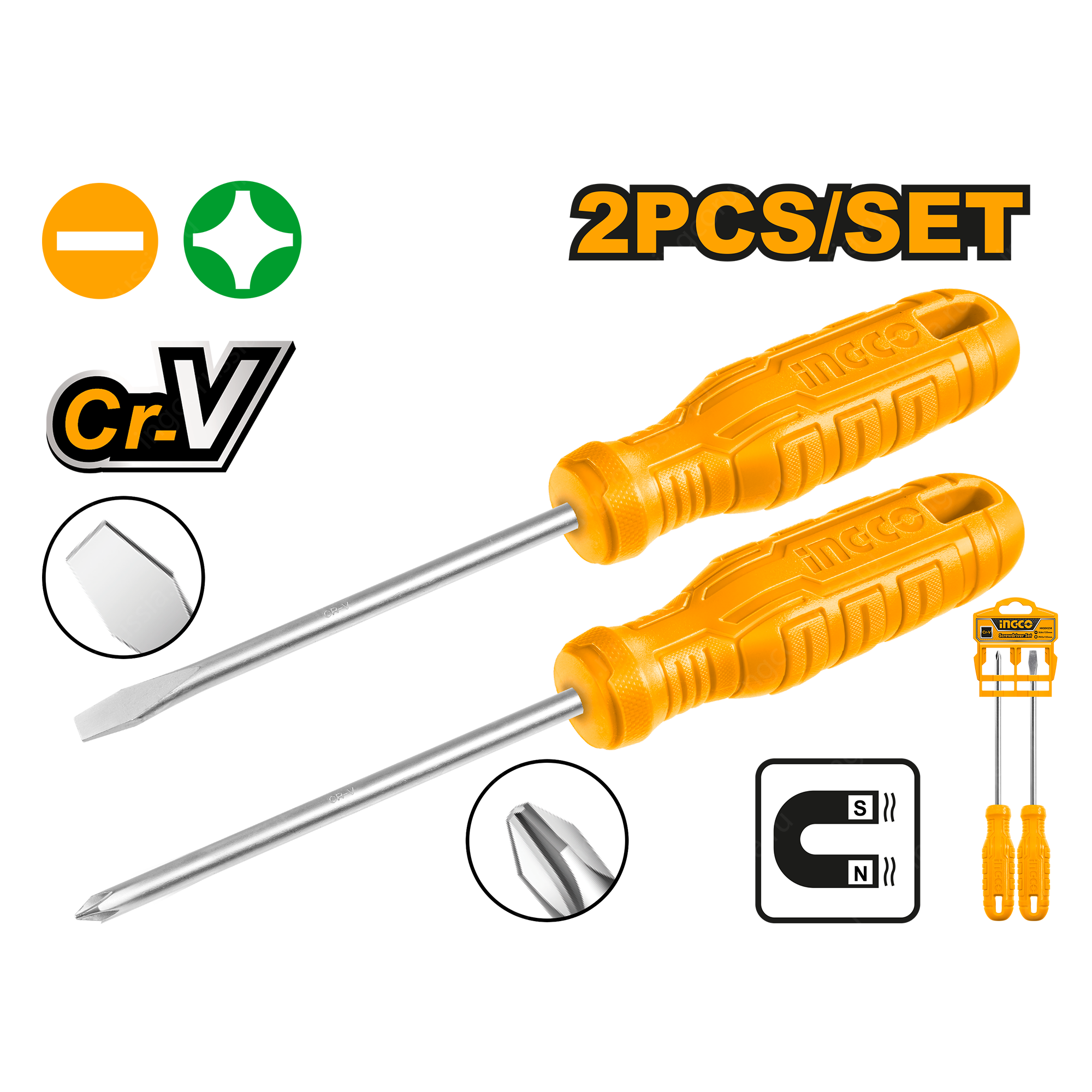 Набор отверток 2 шт INGCO HKSD0258 имеет в комплекте две отвертки с прямым шлицем и с крестовым. Инструменты используются для закручивания и откручивания крепежных элементов.