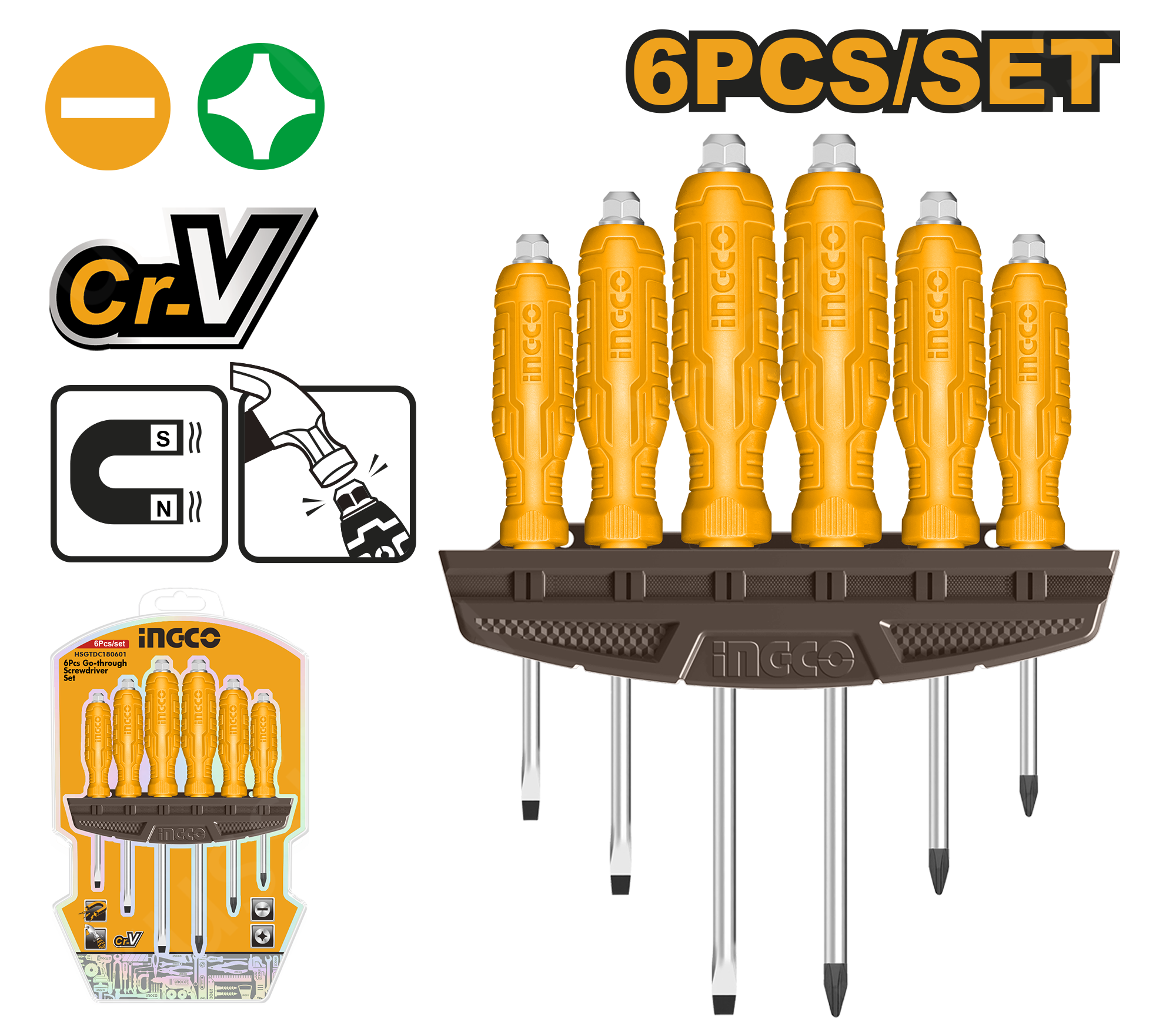 Набор ударных отверток 6 шт. INGCO HSGTDC180601 предназначен для монтажа и демонтажа прикепевшего и крепко затянутого крепежа при помощи ударного инструмента.