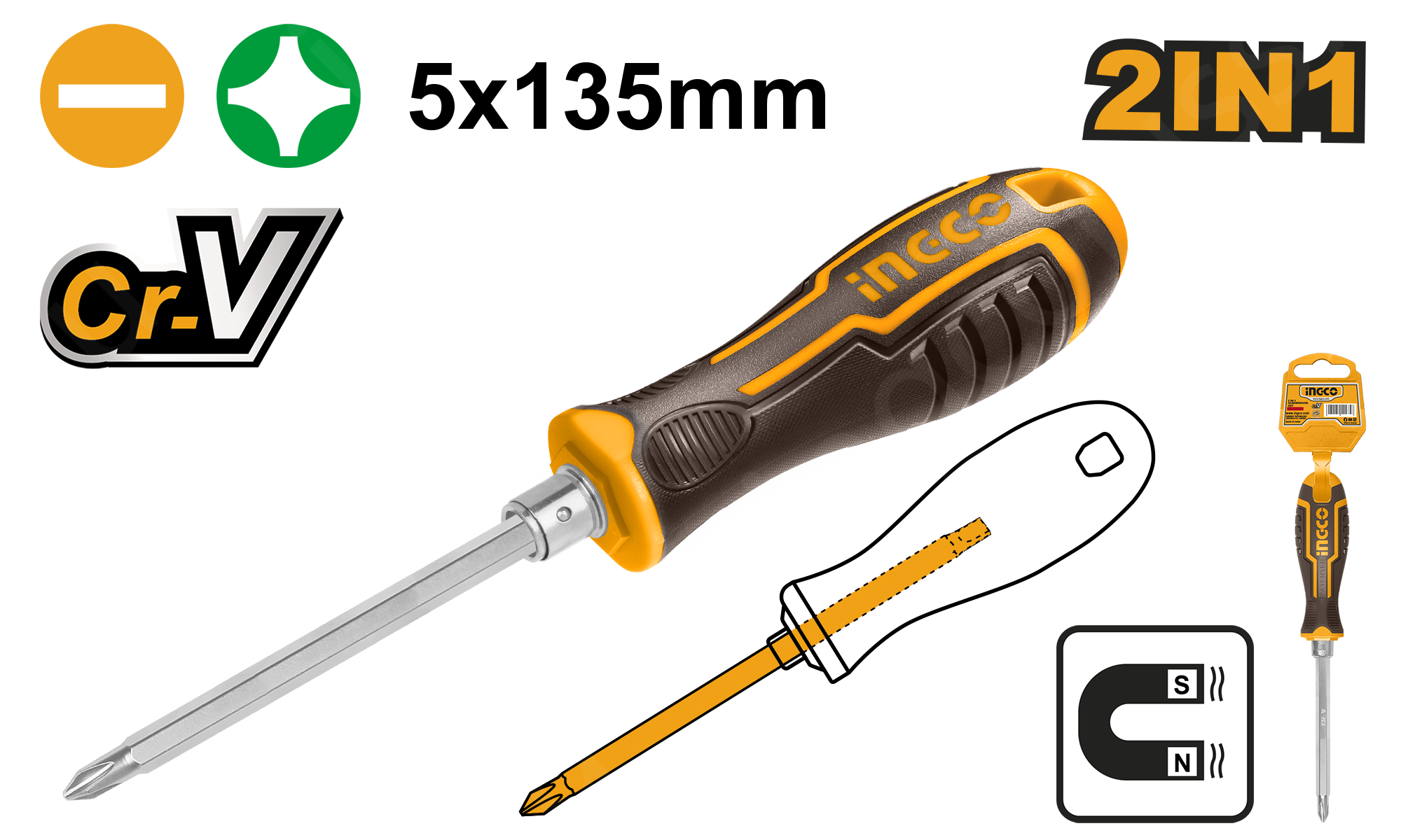 Отвертка двухсторонняя SL5+PH1 INGCO AKISD0203 INDUSTRIAL - инструмент с переставным стержнем, имеющим два рабочих наконечника с разными профилями.