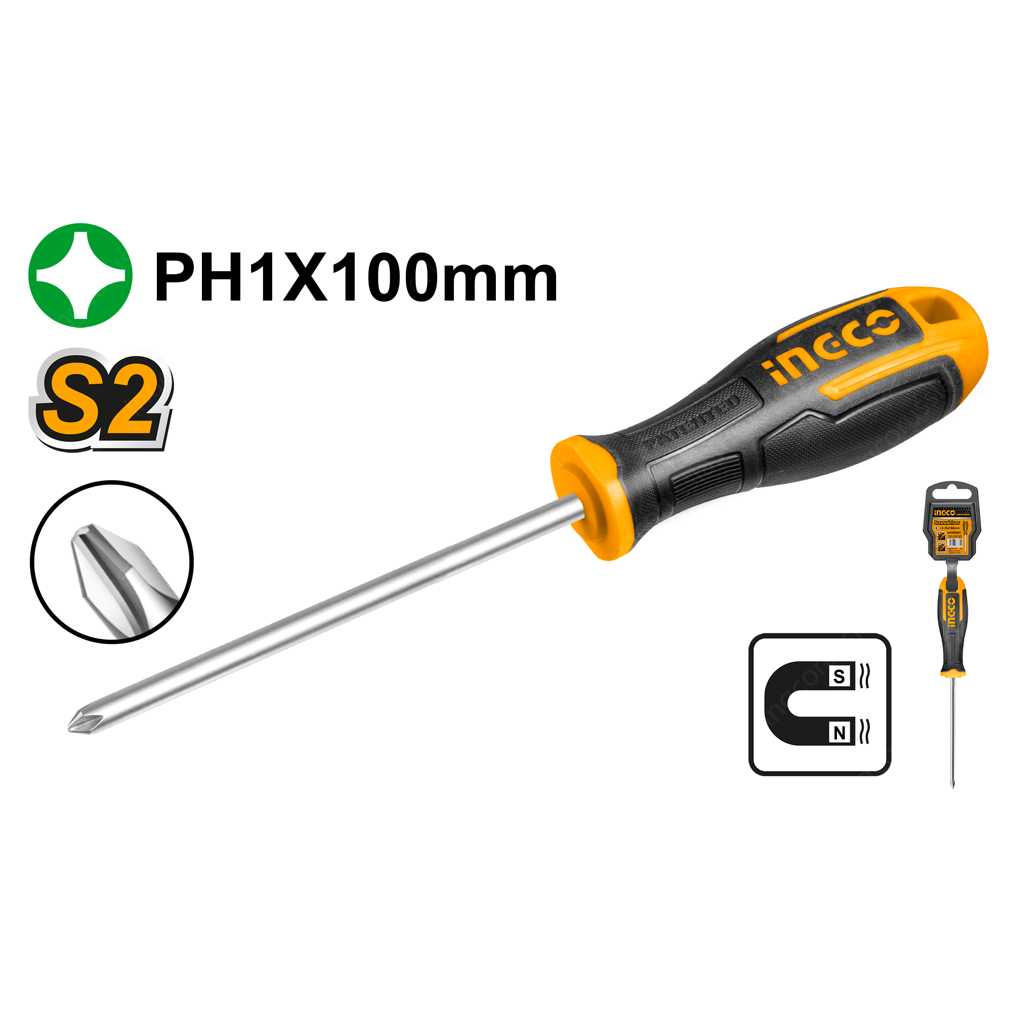 Отвертка крестовая PH1x100 мм INGCO HS68PH1100 INDUSTRIAL с крестовым шлицем Phillips применяется для различных работ с крепежом.