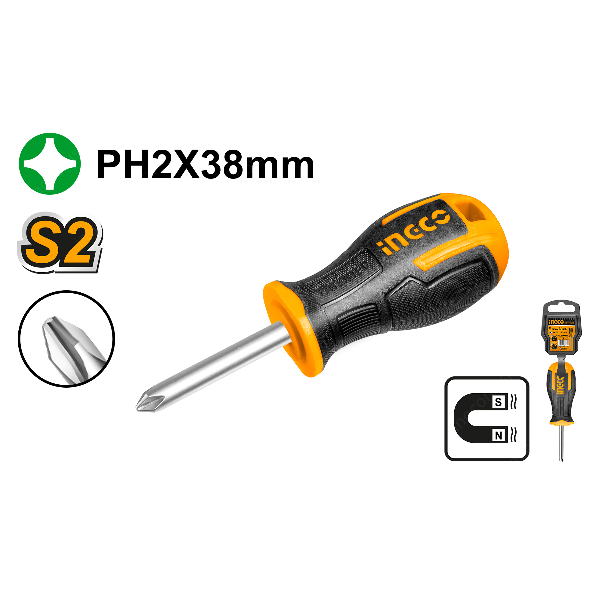 Отвертка крестовая PH2x38 мм INGCO HS68PH2038 INDUSTRIAL с крестовым шлицем Phillips применяется для различных работ с крепежом.