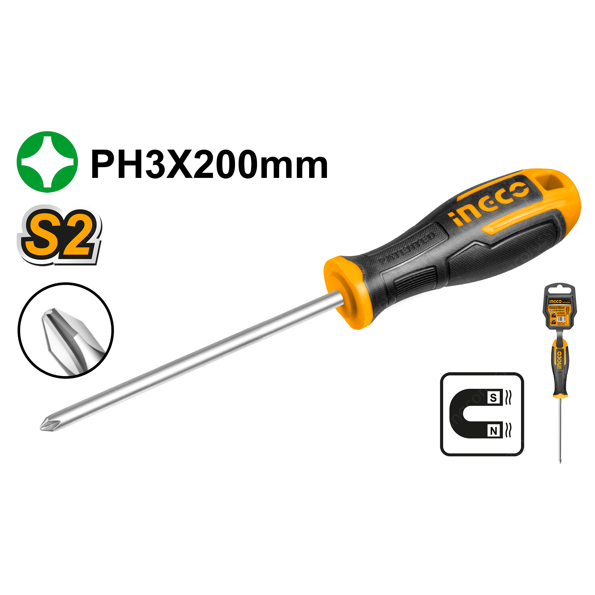 Отвертка крестовая PH3x200 мм INGCO HS68PH3200 INDUSTRIAL с крестовым шлицем Phillips применяется для различных работ с крепежом.