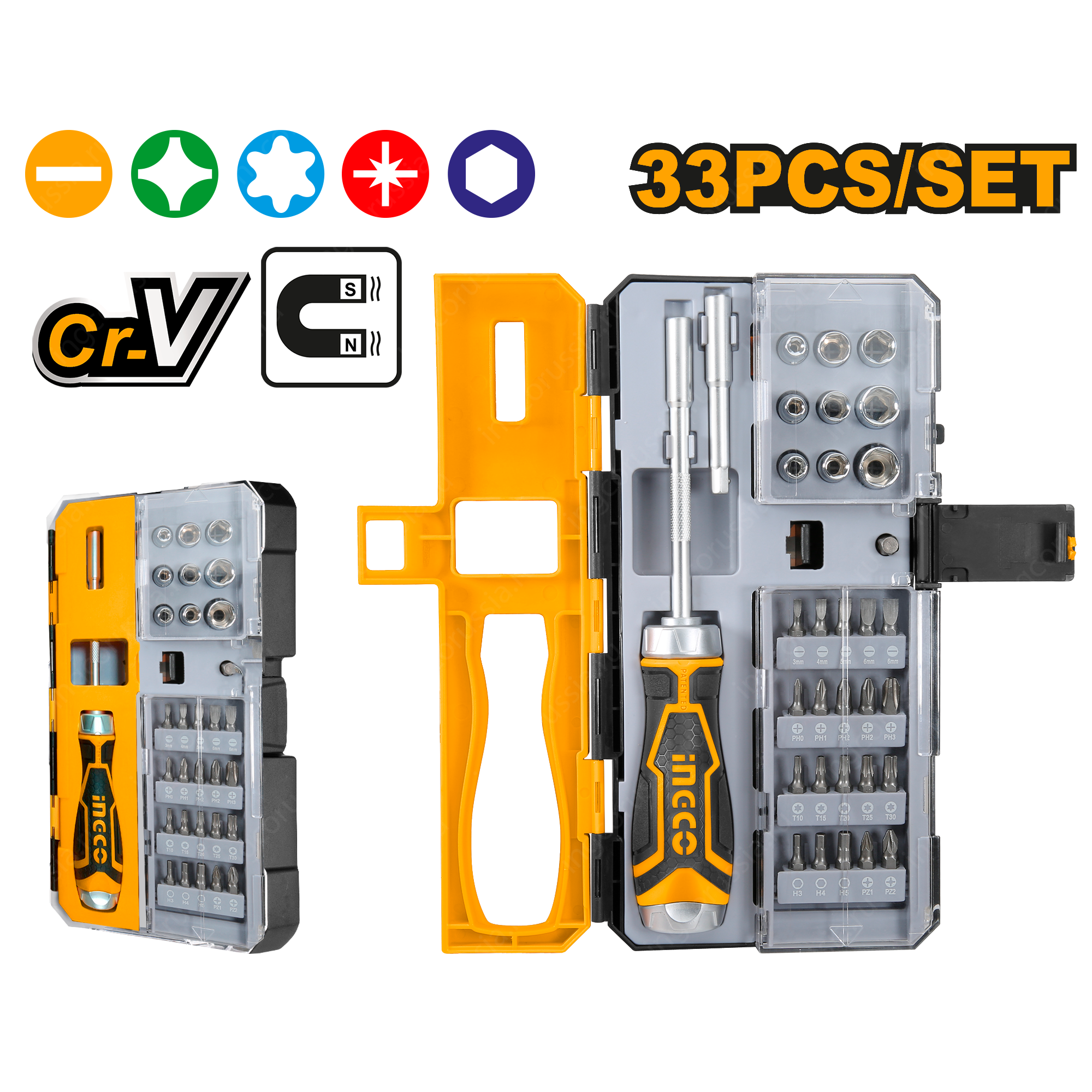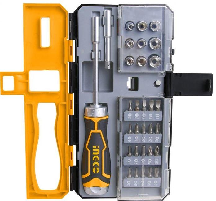 Отвертка с набором бит и головок 33 предмета INGCO HKSDB0338 INDUSTRIAL используется для ремонтно-сборочных работ подходит как для бытовых так профессиональных работ.