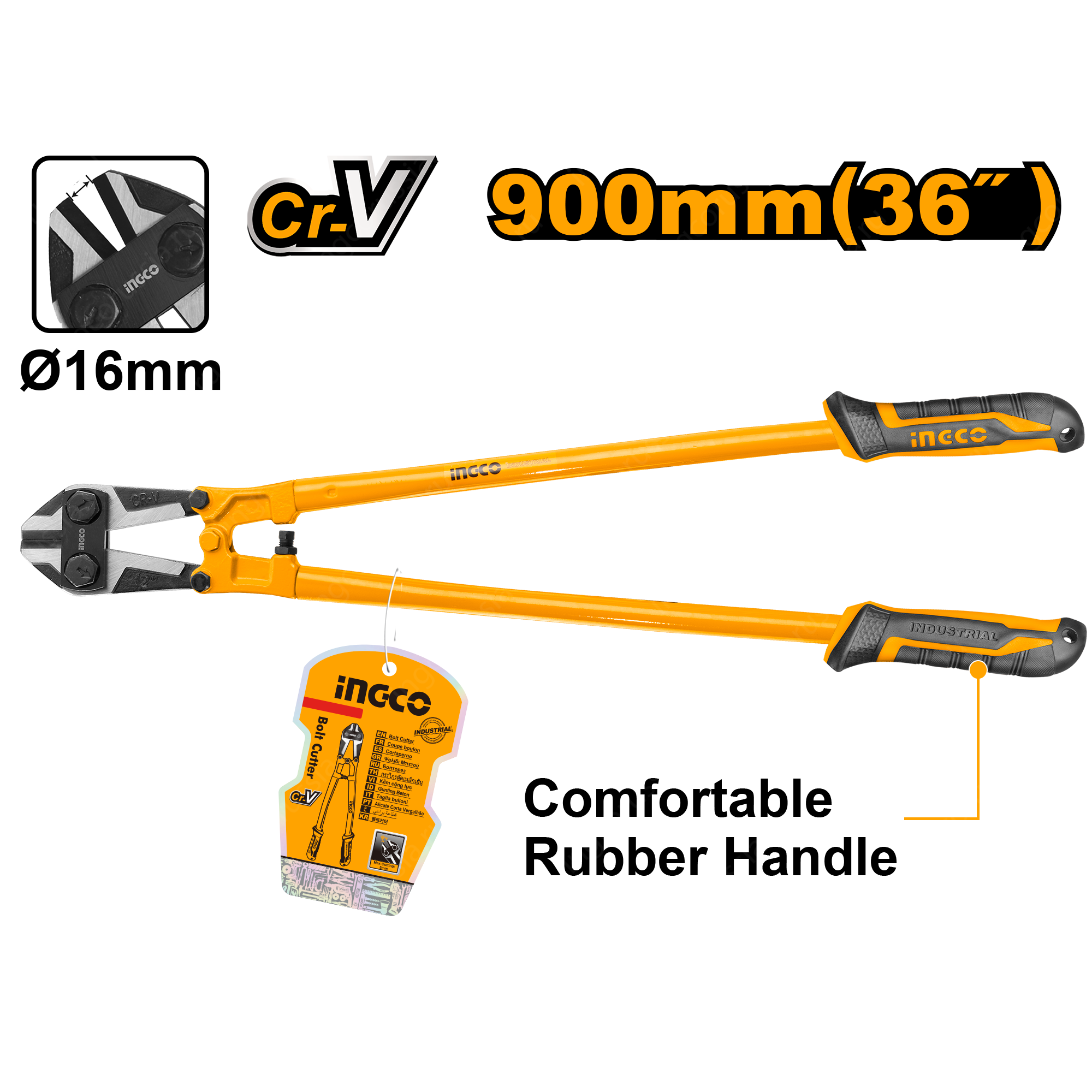 Болторез 900 мм INGCO HBC0836 INDUSTRIAL используется для перекусывания болтов, крепежных элементов, проволоки, тонкой арматуры.Материал режущих губок - хромованадиевая сталь. Рукоятки из термопластичной резины препятствуют скольжению инструмента в руках.