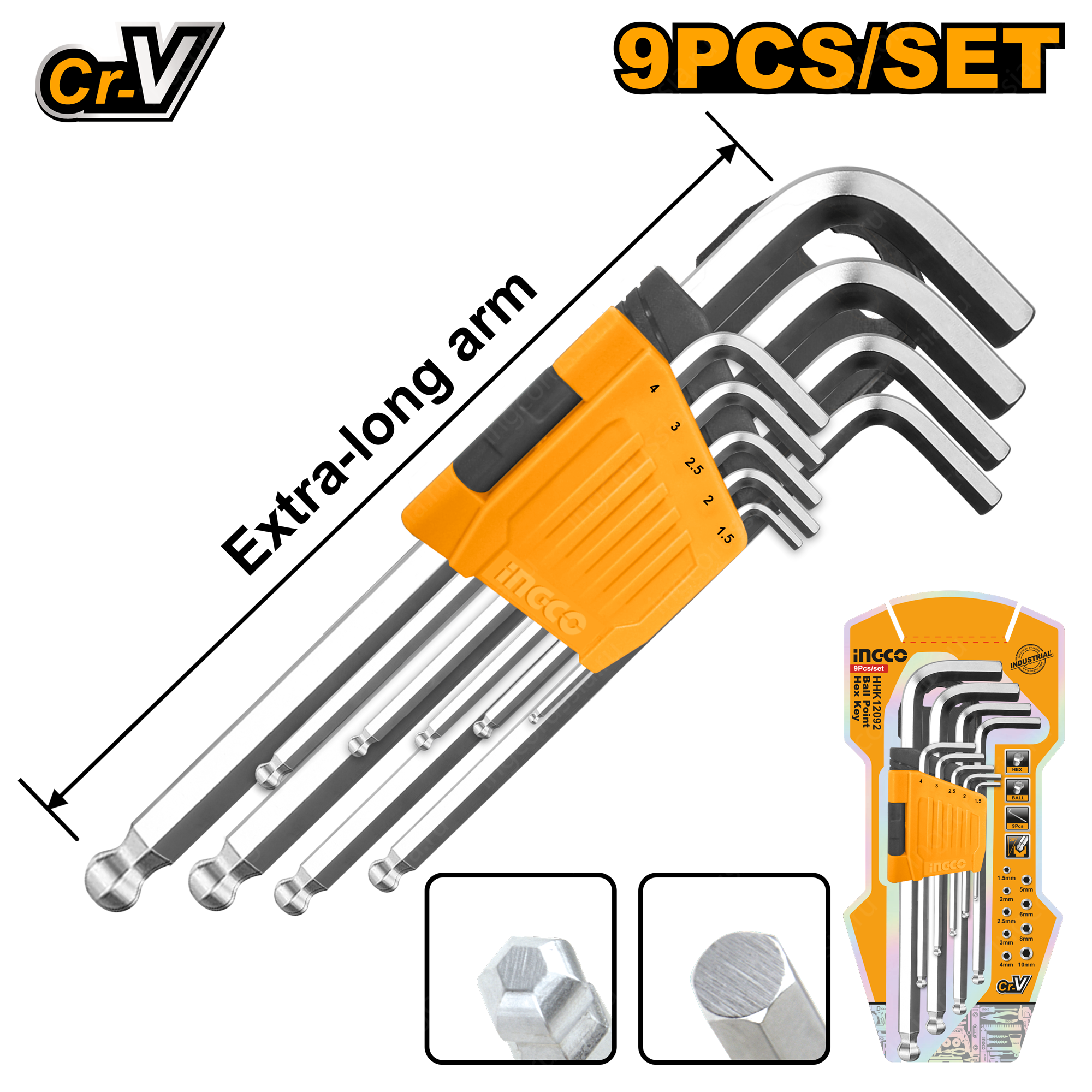 Набор шестигранных ключей с шаром INGCO HHK12092 INDUSTRIAL включает в себя 9 удлиненных ключей различного размера, которые служат для монтажа и демонтажа крепежа с внутренним шестигранным шлицем.