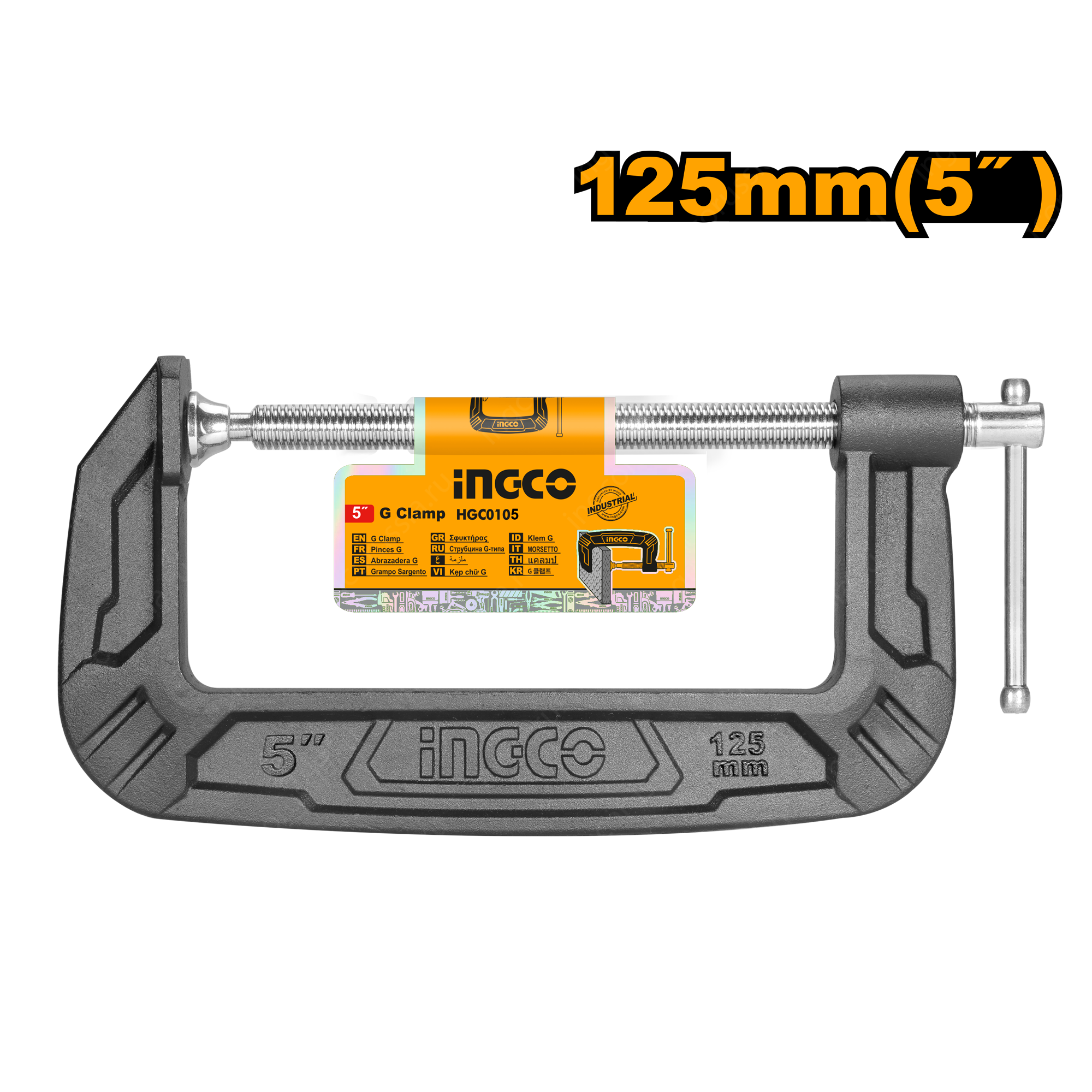 Струбцина G-образная 125 мм INGCO HGC0105 INDUSTRIAL предназначена для зажима и фиксации заготовок и деталей при склеивании и других слесарных работах. Материал корпуса - ковкий чугун. Ширина зажима - 125 мм. Максимальная сила зажима: 900кгс.