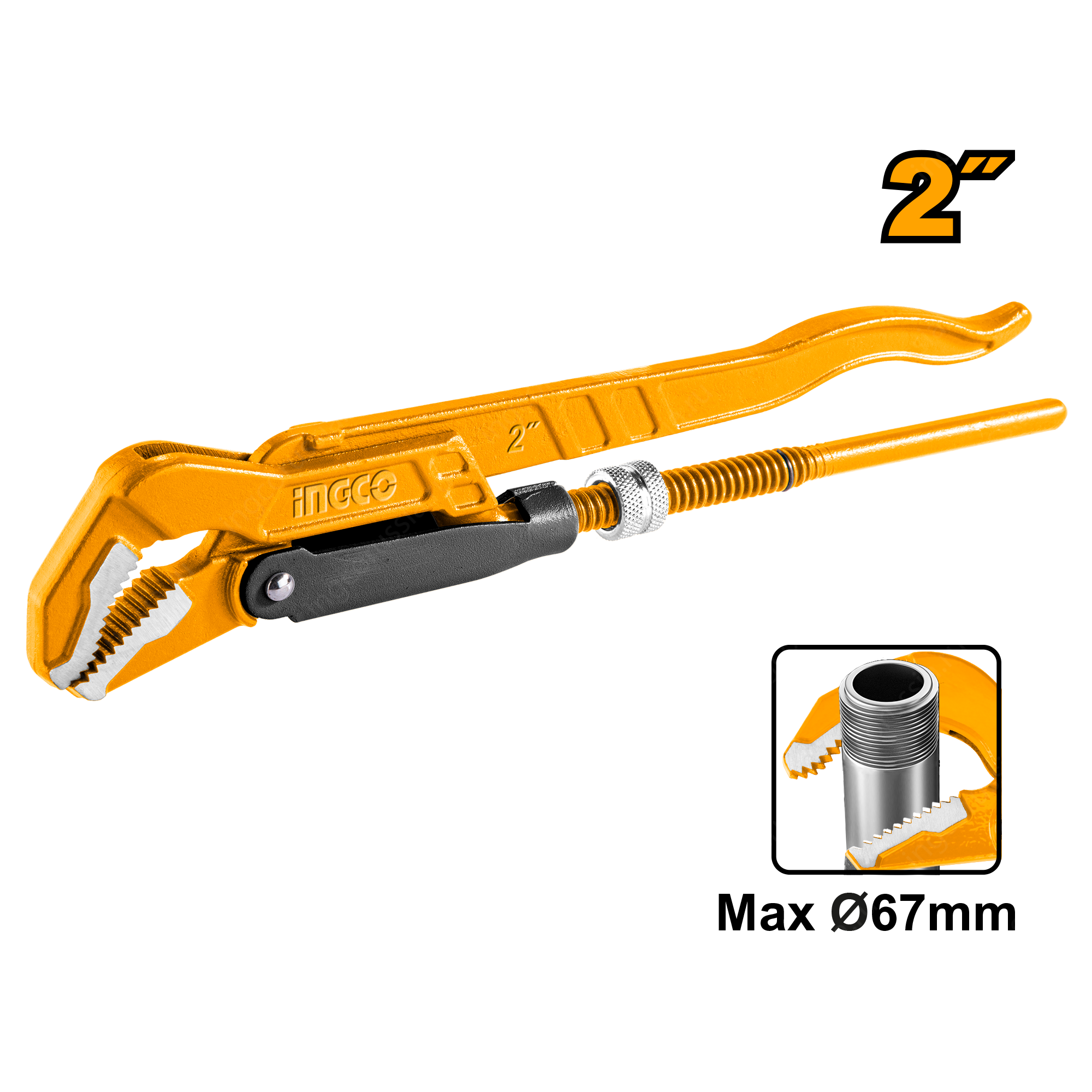 Ключ трубный шведский 2"х67мм тип 45° INGCO HPW04023 обладает усиленной конструкцией, для демонтажа прочных трубных соединений.