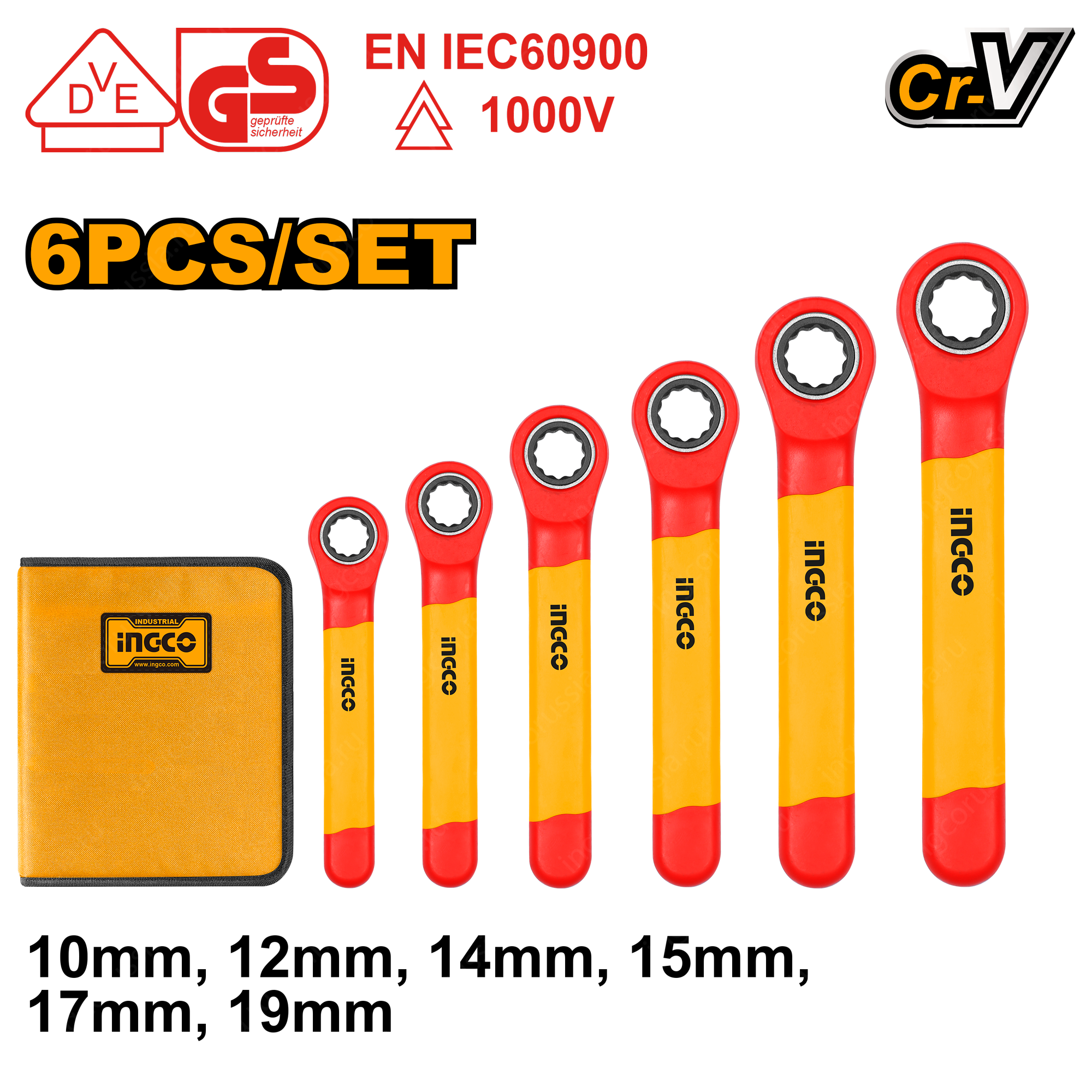 Набор изолированных накидных трещоточных ключей 6 шт. 1000В INGCO HKISPA0603 INDUSTRIAL предназначен для электромонтажных работ под напряжением до 1000 В.