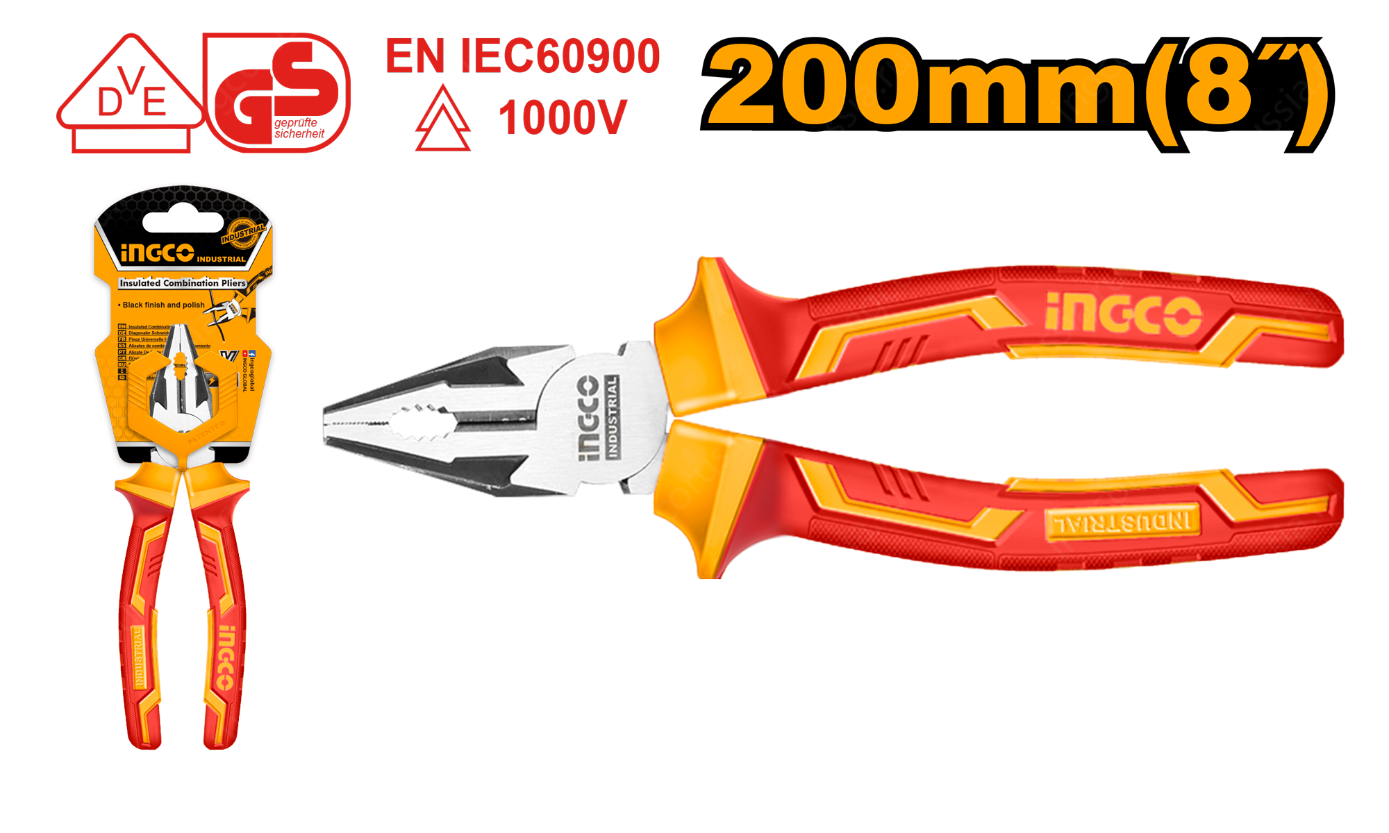 Диэлектрические плоскогубцы 200 мм INGCO HICP28208 INDUSTRIAL - специализированный ручной инструмент, предназначенный для работы под высоким напряжением (до 1000 В переменного тока). Применяются для захвата и удержания предметов различной формы, а также для перекусывания проводов или проволоки.